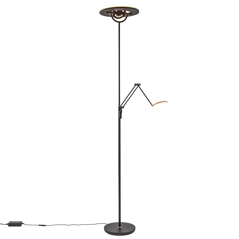 Deze prachtige vloerlamp is een combinatie van twee lampen, namelijk een uplighter en een leeslamp. De vloerlamp is gemaakt van metaal en voorzien van een mat zwarte finish. Halverwege het armatuur is een verstelbare leeslamp gemonteerd die zowel kan draaien als kantelen. Bovenaan is de lamp afgewerkt met een dubbele uplighter. Deze zijn los van elkaar te kantelen. Op het armatuur zitten twee dimmers waarmee de leeslamp en uplighters bediend kunnen worden. Ideaal voor sfeer en functioneel licht.
