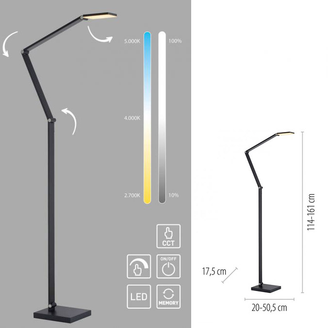 Highlights • Verkrijgbaar in brons en grijs/antraciet • In hoogte en reikwijdte verstelbaar (114–161 cm) • Geïntegreerde LED met instelbare lichtkleur (CCT) • Touchdimmer met geheugenfunctie • Ideaal als leeslamp naast bank of fauteuil