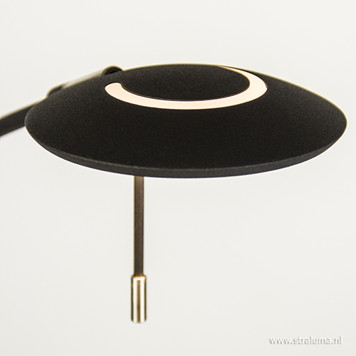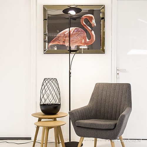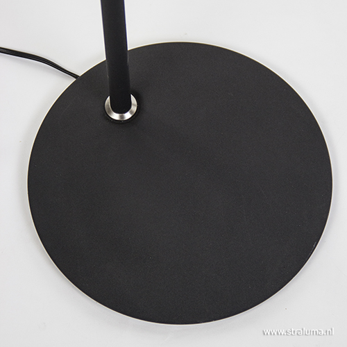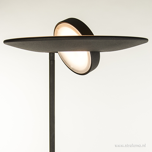 Deze moderne vloerlamp in een zwarte kleur is een mooie toevoeging aan uw interieur. De LED staande lamp is voorzien van een uplighter en een leeslamp voor extra gemak. Voordeel van de uplighter is dat de middenspot zowel naar onder als naar boven kan schijnen. De spot is gemakkelijk te draaien naar een gewenste positie. Ook de schaal zelf is te kantelen voor de juiste manier van belichten. Het leeslampje is ook te verstellen en heeft als leuk extraatje een speels licht effect aan de bovenzijde. Deze zwarte vloerlamp is voorzien van LED lichtbron en is in vier kleuren verkrijgbaar: brons, staal, messing en zwart. Beide lichtbronnen zijn eenvoudig te dimmen via een dimmer halverwege de stang.