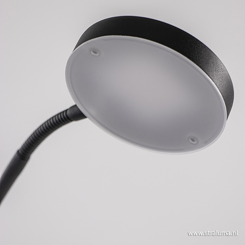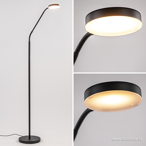 Een perfecte vloer/leeslamp. De mat zwarte leeslamp past prima naast een bank of stoel en is vanaf die plek ook gemakkelijk te bedienen. De schakelaar is te vinden op het armatuur, de lamp gaat door een druk op de bovenste knop snel aan of uit. Houdt u de knop langer ingedrukt dan dimt u gemakkelijk naar de gewenste sfeer. Ideaal voor wanneer u wilt lezen of gezellig tv wilt kijken. Daarnaast kunt u ook de verlichting aanpassen met de onderste knop van warm tot koud. Houdt ook deze ingedrukt totdat u de gewenste temperatuur heeft gevonden. Wat de moderne staande lamp ook ideaal maakt is dat deze op twee plekken is te verstellen, zowel bij het armatuur als bij de kap. Zo kunt u de lamp kantelen en draaien om zo altijd de juiste kant op te laten verlichten. De moderne leeslamp wordt geleverd inclusief zwart snoer.