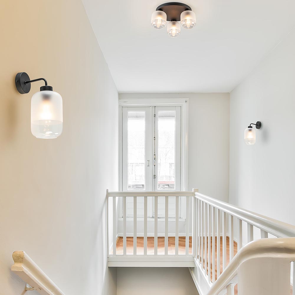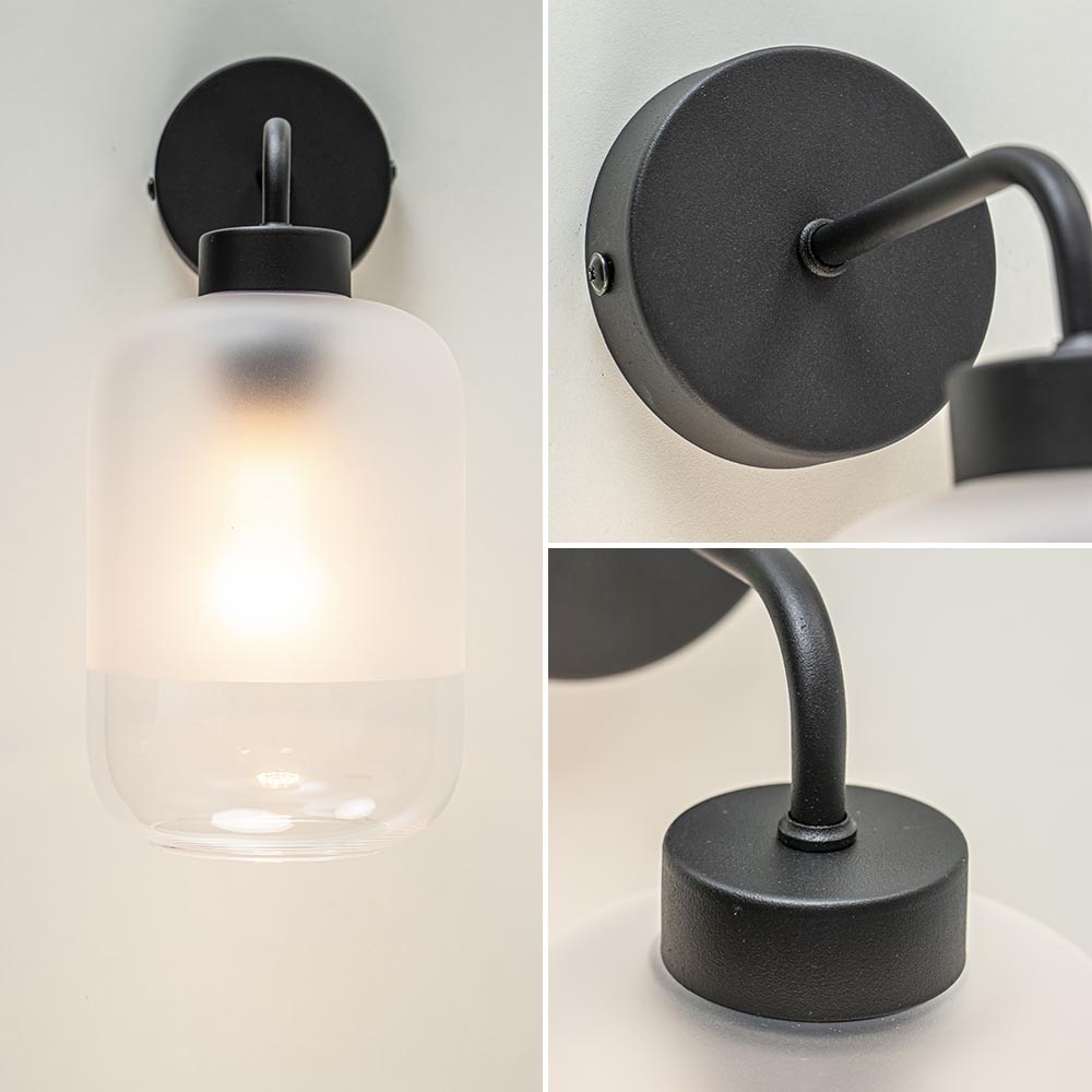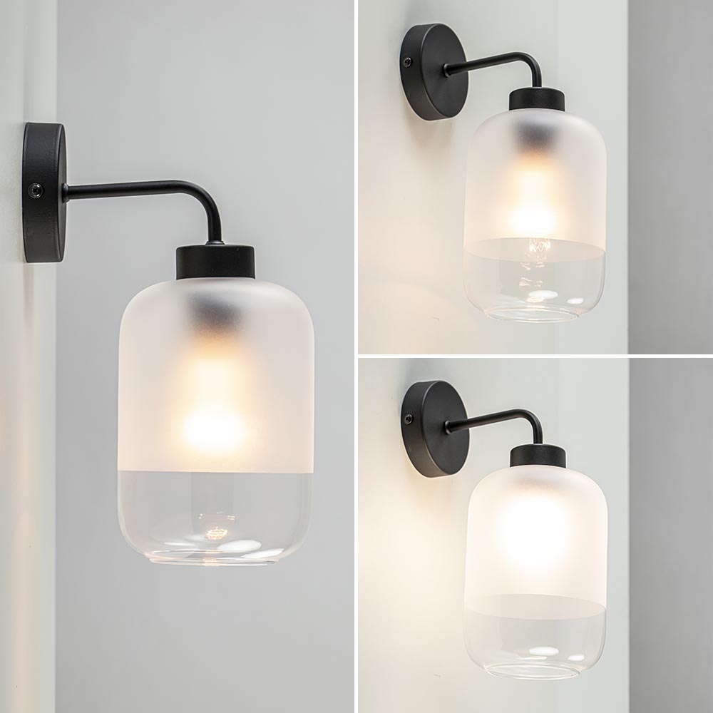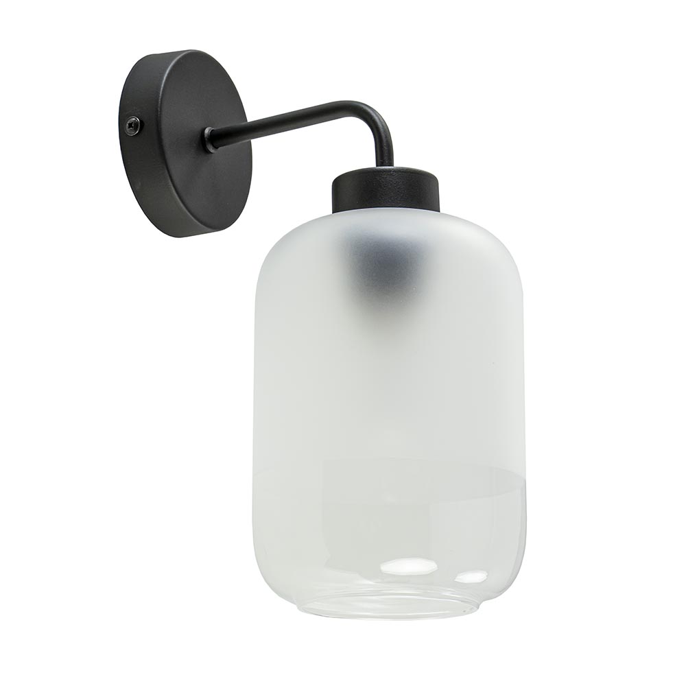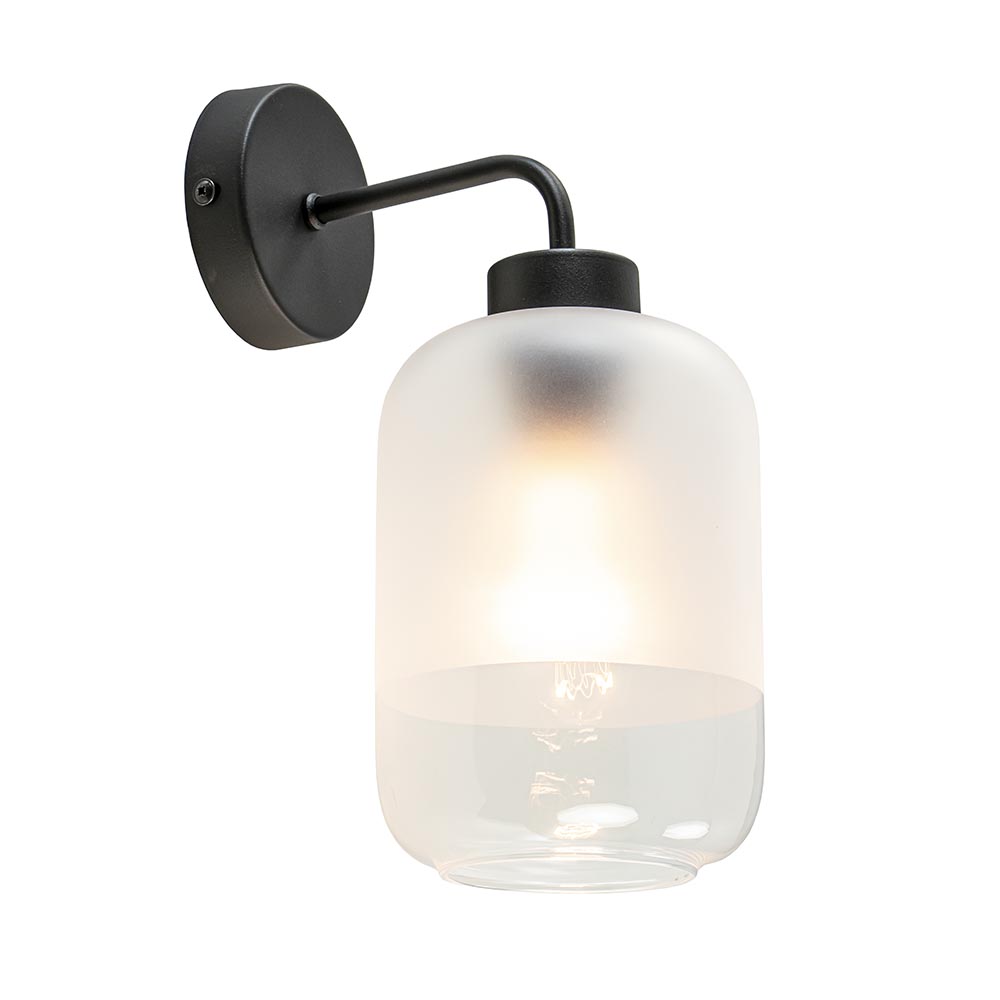 Een moderne wandlamp die prima geschikt is voor een woonkamer, slaapkamer of hal. De wandlamp is niet voorzien van een snoer, een stroompunt is dus van belang. De wandlamp heeft een mat zwarte bevestiging met een kleine arm waar een helder glazen kap aan hangt. Het glas loopt van mat naar helder waardoor er niet direct in de lichtbron kan worden gekeken maar toch een fijne lichtverspreiding plaatsvindt. De wandlamp past mooi in een modern of Scandinavisch interieur.