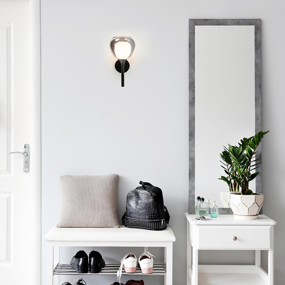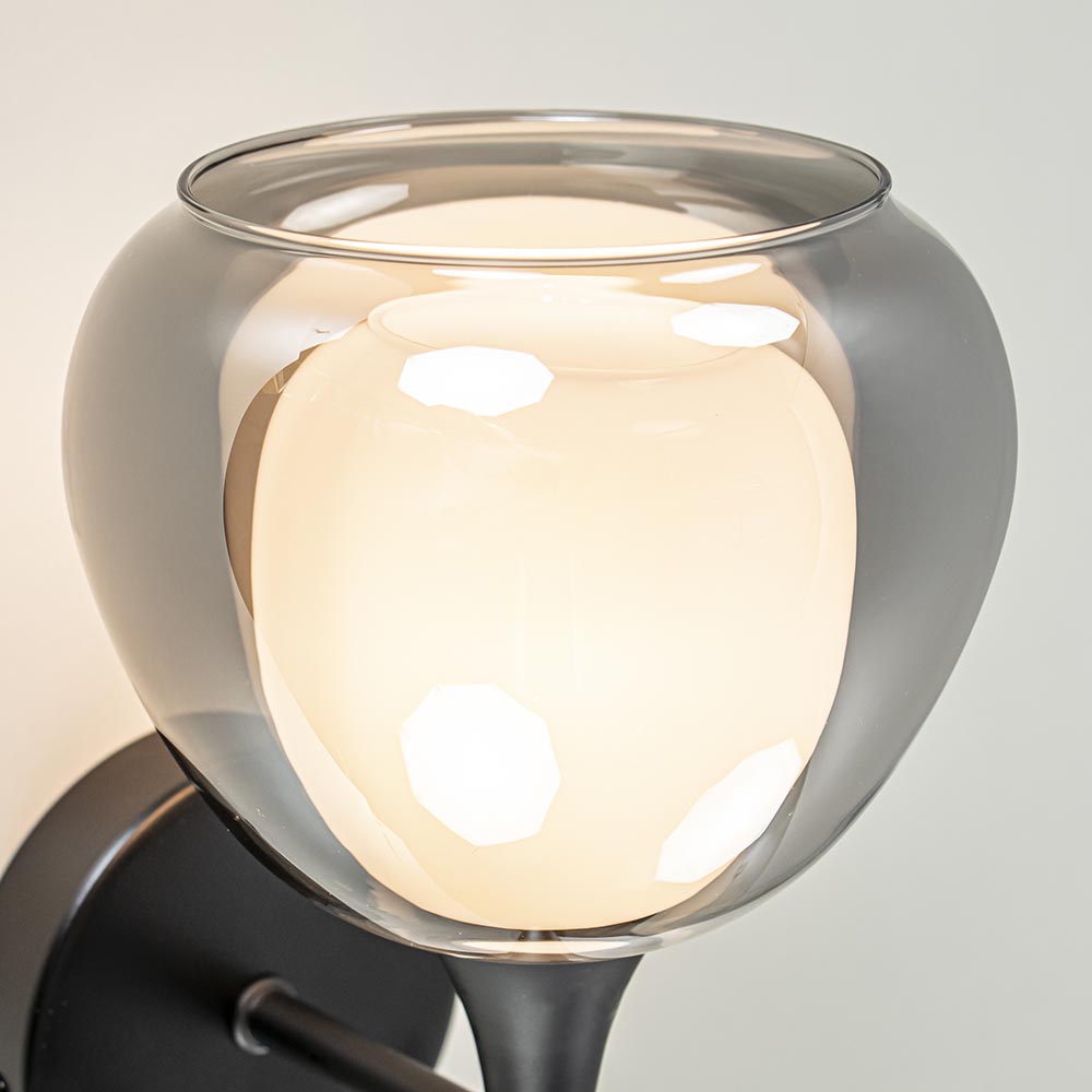 Een mooie sfeervolle wandlamp met een dubbele laag. De moderne wandlamp is voorzien van een smoke glazen kap die met zijn titanium look een mooi spiegelend effect heeft wanneer de lamp is uitgeschakeld. Schakelt u de lamp in, dan komt er een wit binnenglas tevoorschijn die zorgt dat het licht mooi diffuus wordt verspreid. Het mat witte binnenglas zorgt er tevens voor dat u niet direct in de lichtbron kijkt. Het smoke glas wordt donker transparant wanneer de lamp is ingeschakeld en zorgt zo voor een luxe uitstraling. Het glas is bevestigd op een zwart metalen armatuur die met een ronde bevestiging op de wand wordt opgehangen. De wandlamp wordt geleverd zonder snoer en moet dan ook direct op een stroompunt worden aangesloten. Een leuke toevoeging naast uw bed of bank, of sfeervol in de hal of overloop. Het smoke glas zorgt ervoor dat de lamp is diverse woonstijlen is te combineren.