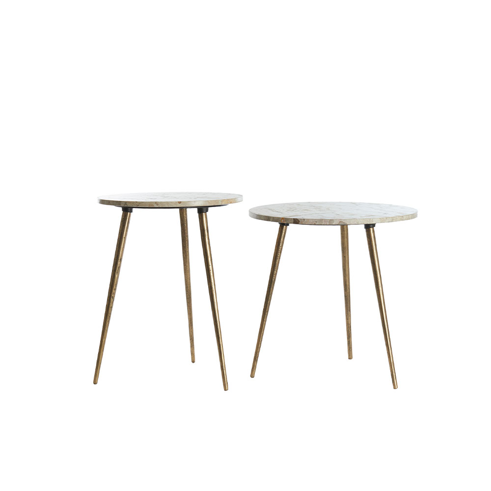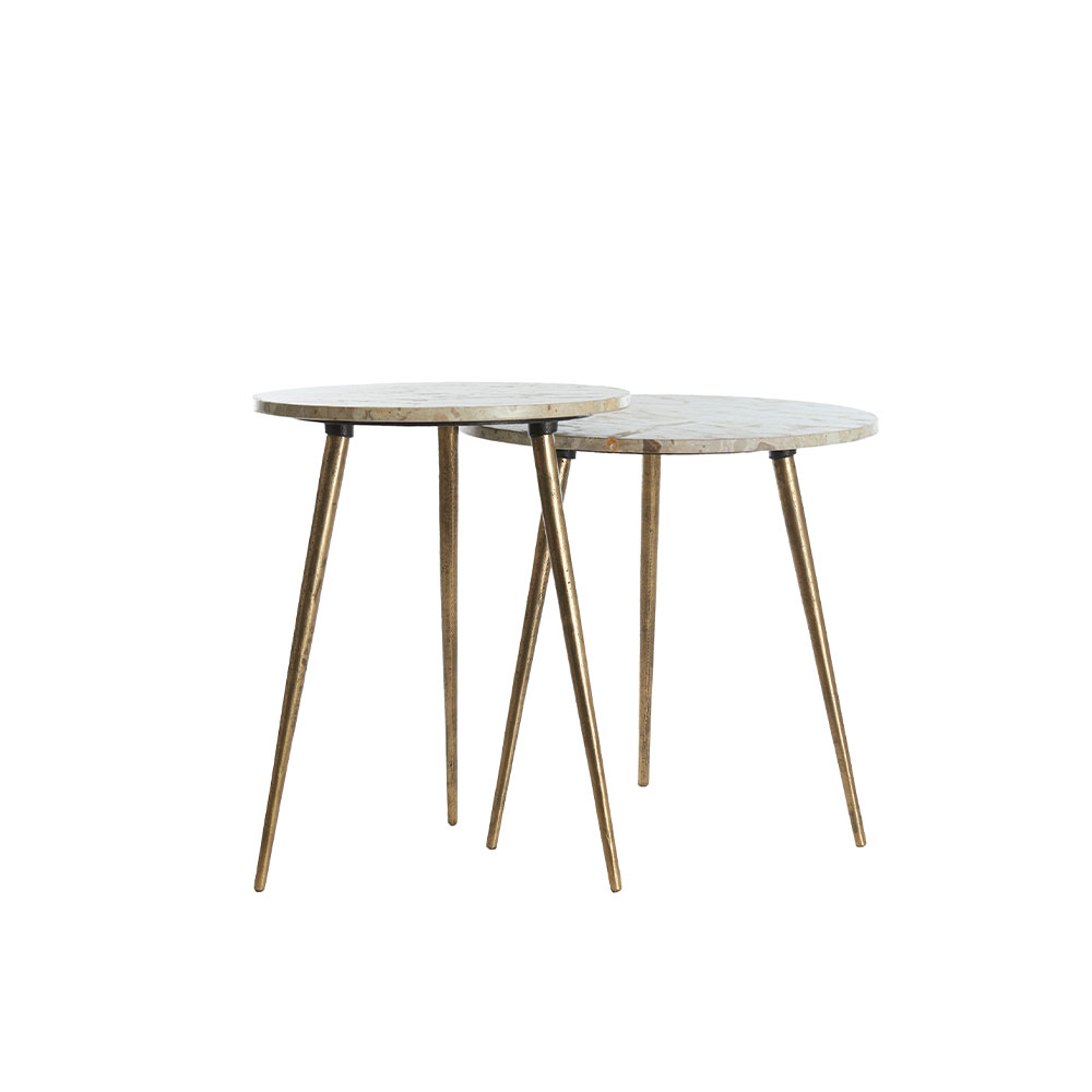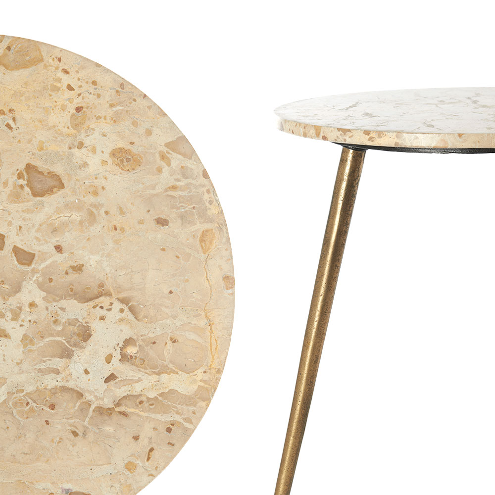 Bijzettafels set van 2 Zeca – Taupe marmer & antiek brons – Ø41×49 cm & Ø48×53 cm