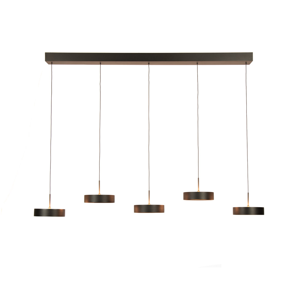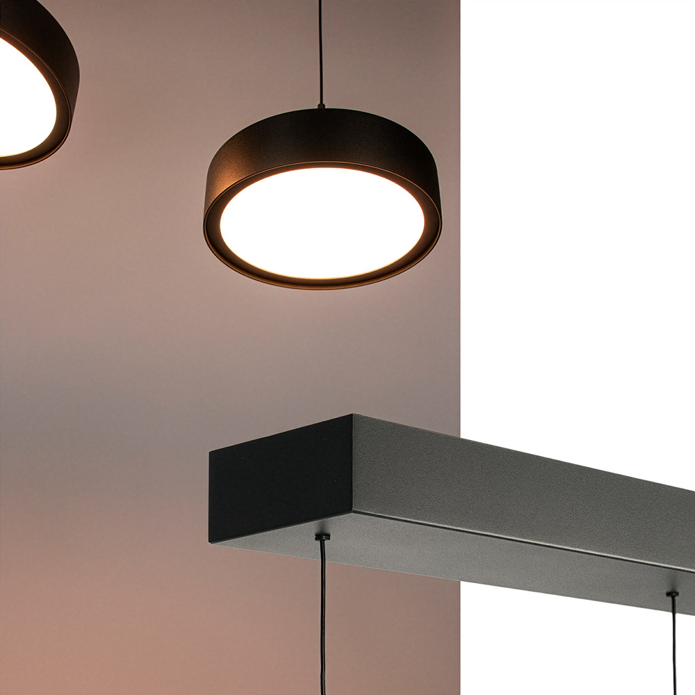 De Alieno 5-lichts hanglamp is een moderne eyecatcher voor boven de eettafel of het kookeiland. De langwerpige plafondbevestiging draagt vijf afzonderlijke ronde lichtmodules die speels onder de balk hangen. Elk cirkelvormig lichtpunt geeft licht zowel naar beneden als naar boven, waardoor er een mooie balans ontstaat tussen functioneel licht op het tafelblad en sfeervol indirect licht richting het plafond.