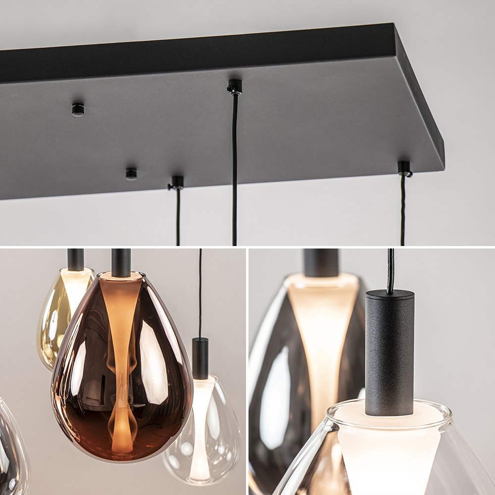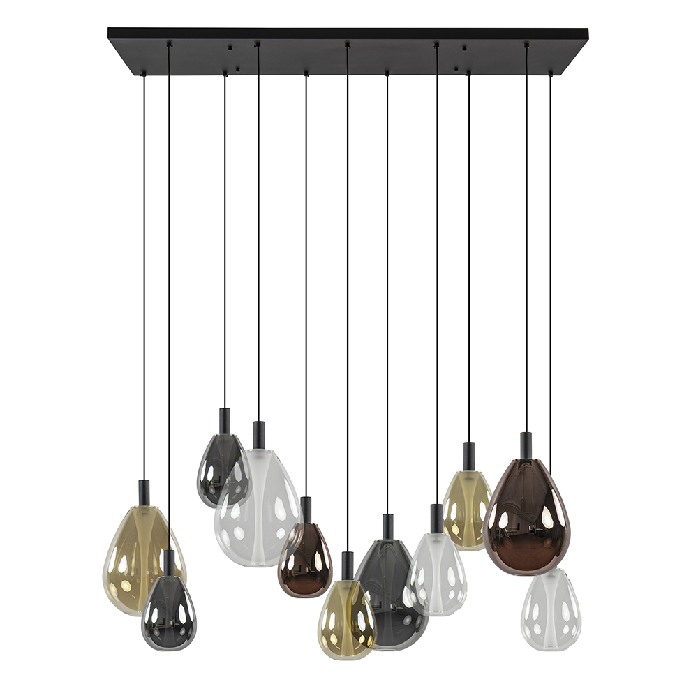 Een echte wauw-factor voor boven de eettafel. Deze luxe 11-lichts hanglamp straalt een en al luxe en elegantie uit. De hanglamp heeft een mat zwart armatuur dat is gecombineerd met diverse glazen kappen in de kleur smoke, amber, rose en helder. Dit geeft de hanglamp echt die hotel chic uitstraling. Dit wordt versterkt door het matte binnenglas dat oplicht wanneer de lamp wordt ingeschakeld. Zo onstaat er een mooi effect in het glas. De grote hanglamp is voorzien van geïntegreerd LED en geeft met 2700 Kelvin een fijne en sfeervolle warm witte verlichting. Dit is dimbaar middels een externe dimmer (exclusief).