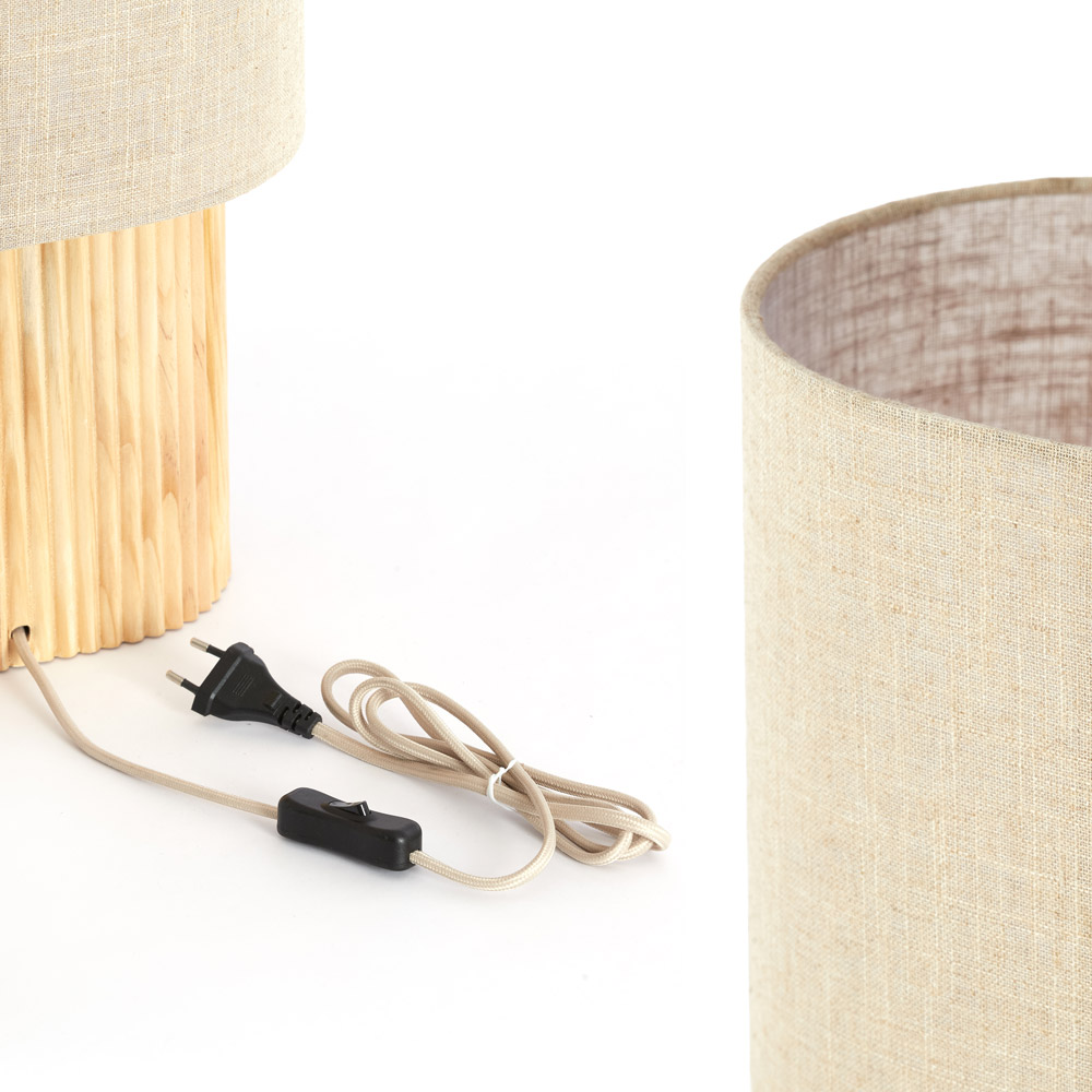 • Kleur: Beige / Naturel hout • Afmetingen: H 70 × L 30 × B 20 cm • Snoerlengte: 155 cm • Materiaal: Hout / Textiel • Fitting: E27 • Lichtbron: Niet inbegrepen • Dimbaar: Ja, via externe schakelaar en geschikte lichtbron (niet inbegrepen)