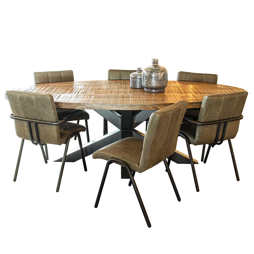 Mooi bij een ovale tafel, maar ook prima toepasbaar bij een rechthoekige of ronde tafel. Deze eetkamerstoel heeft een stoere robuuste uitstraling. De zitting en rugleuning zijn volledig van leder en de pootjes en het frame zijn van metaal met een zwarte afwerking. De sticksels in de rugleuning geven de stoel een landelijke look. De stoel is ook mooi te combineren met het model met armleuning.