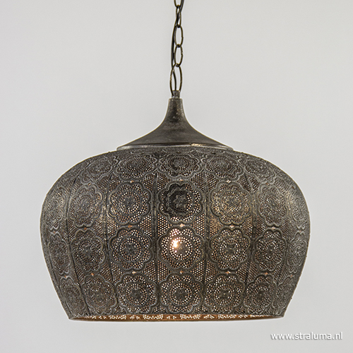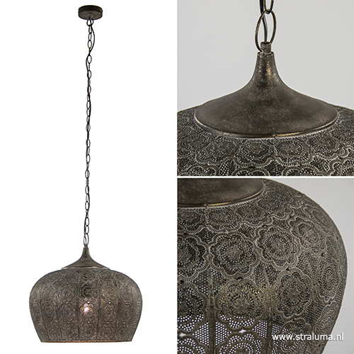 Oosterse invloeden blijven we terug zien in het interieur, dit is een prachtig voorbeeld. De metalen hanglamp heeft een kap met een bloemmotief, zoals we deze ook veel op de tegeltjes zien, die zorgt voor een sfeervolle en gezellige verlichting. De goud/bruine kleur zorgt voor een warme uitstraling, waardoor de oosterse hanglamp ook mooi past in een landelijke setting. De hanglamp wordt opgehangen met een ronde bevestiging en is in hoogte te verstellen door schakels uit de ketting te verwijderen.