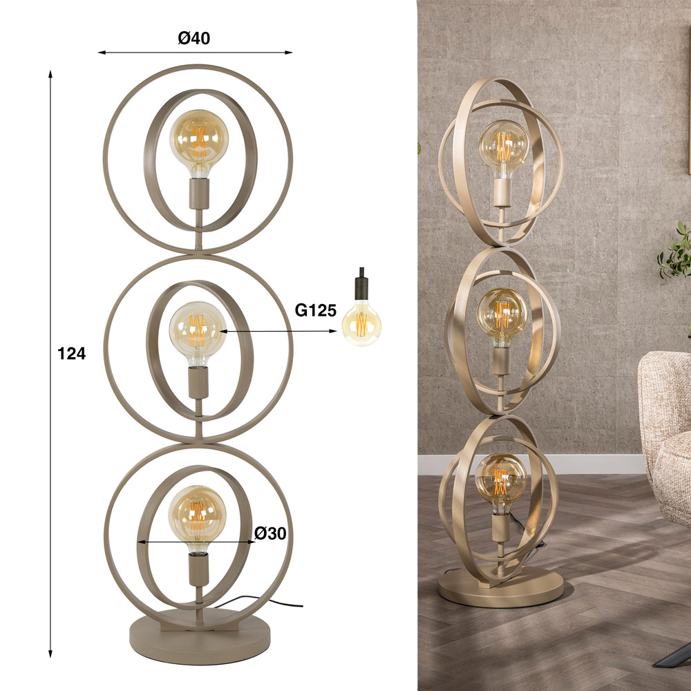 Highlights • Sculpturale vloerlamp met drie open ringelementen • Beige metalen afwerking voor een warme, moderne uitstraling • Ontworpen voor decoratieve G125 LED-lichtbronnen • Perfect als statementlamp naast bank, fauteuil of in een ruime hoek