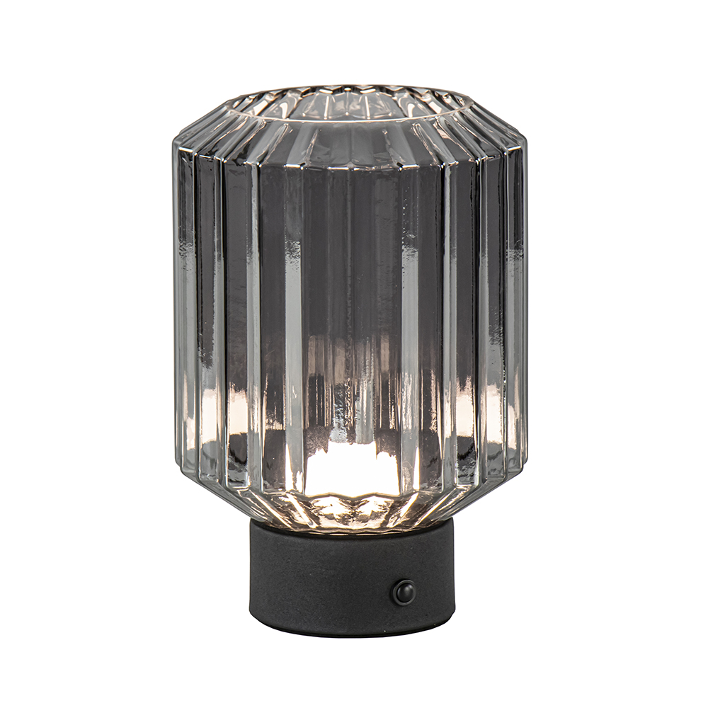 – afm: Ø13×19,5 cm – voet: Ø7,5×4 cm – kap: Ø13×15,5 cm – glas, smoke/titanium – metaal, zwart – inclusief LED – 100 lumen – 3000 Kelvin – 3-standen dimbaar – oplaadbaar – inclusief USB kabel
