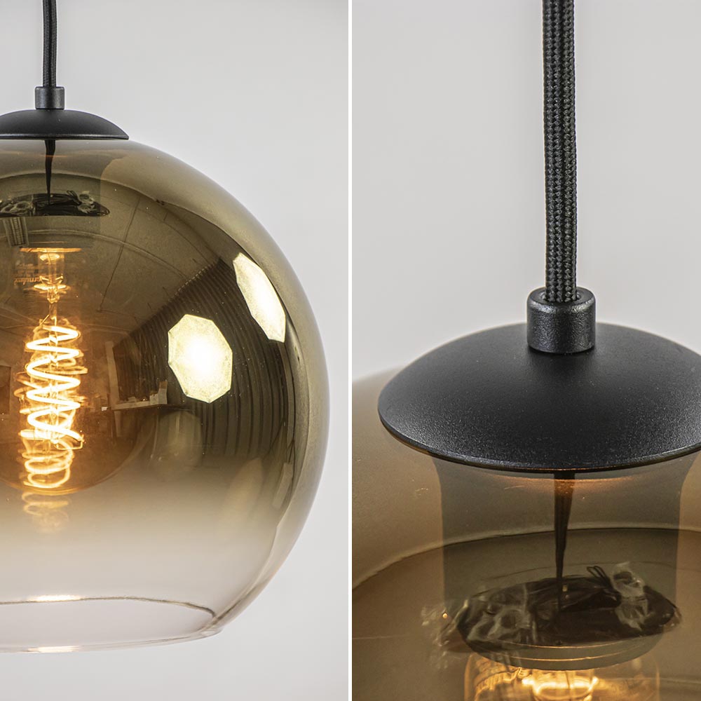 Een prachtige hanglamp voor boven de eettafel. Een nieuwe trend in de verlichting is de ovale plafondplaat. Deze hanglamp heeft er een van maar liefst 100 cm lang. De plaat is van metaal en afgewerkt met een mat zwarte finish. De bevestiging zelf heeft een afmeting van 97×35 cm, de afwerktplaat heeft een afmeting van 100×35 cm. Over de plaat zijn 5 lichtpunten verdeeld. Deze zijn voorzien van zwarte stof omwonden snoeren die naar wens in hoogte zijn te verstellen. De maximale hoogte is 180 cm. De mat zwarte ovale plaat is gecombineerd met ronde glazen bollen verdeeld over 2 afmetingen. De combinatie van het mat zwart en het goud/heldere glas geeft de hanglamp een luxe chique uitstraling die mooi is toe te passen in diverse woonstijlen. De ovale hanglamp met glazen bollen is dimbaar middels een externe dimmer en wordt geleverd zonder lichtbron (5x E27).