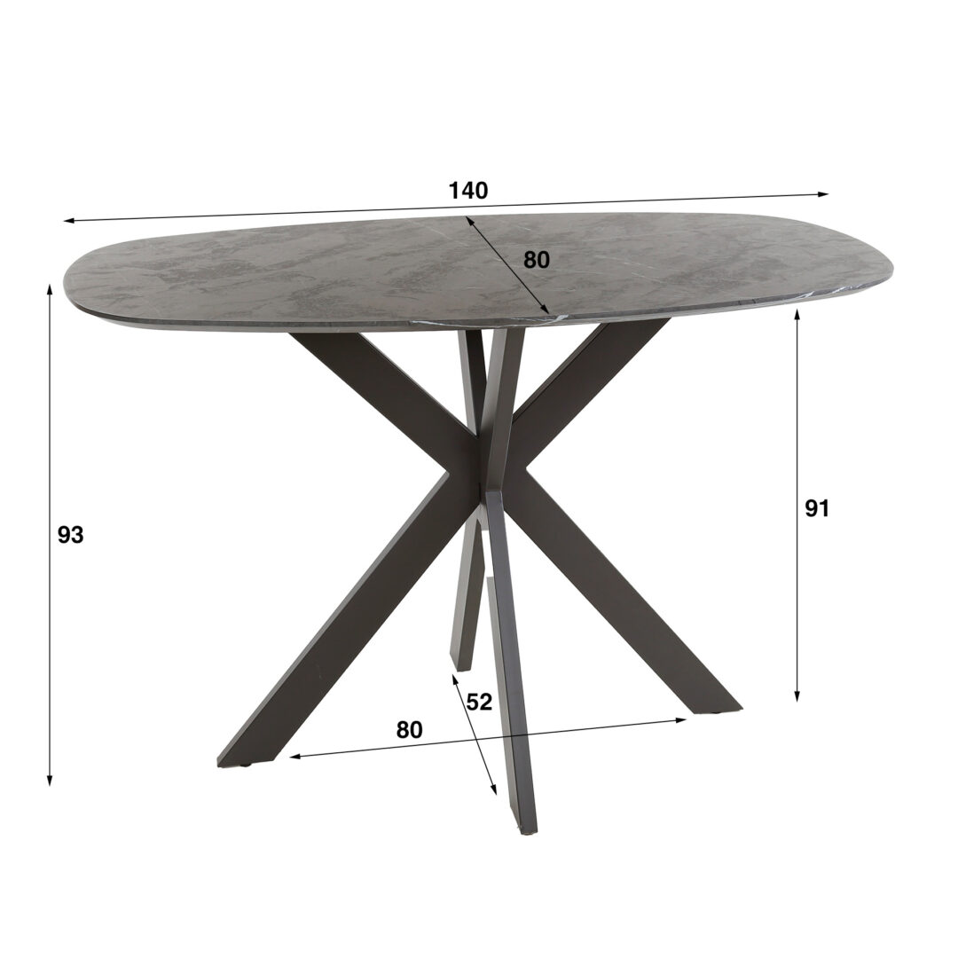 • Materiaal blad: 3D melamine (graphite) • Onderstel: Metaal • Afmetingen: L 140 × B 80 × H 93 cm • Afstand tot onderzijde blad: 91 cm • Afstand tussen de poten: 80 cm • Zitplaatsen: 4 personen