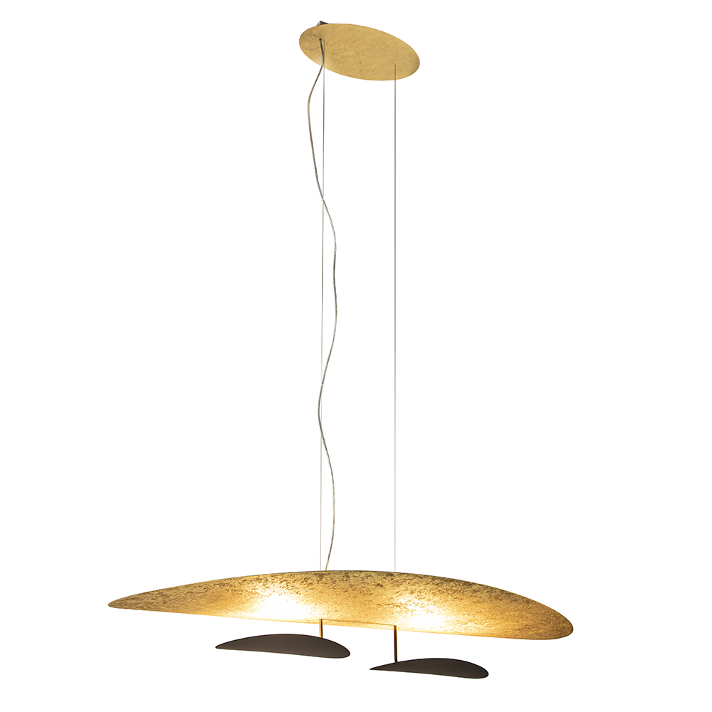 Deze grote design hanglamp is een ware verrijking voor de eetkamer. De ovale kap heeft een afmeting van maar liefst 130×64 cm en is volledig gemaakt van metaal. Dit is voorzien van een goldleaf en mat zwarte coating wat de lamp een luxe uitstraling geeft. De ovale kap heeft 3 LED lichtpunten, 2 aan de onderzijde en 1 bovenop de kap. Doordat deze alle 3 omhoog verlichten ontstaat er een mooie warme indirecte verlichting welke dimbaar is middels een externe dimmer (exclusief). De grote kap hangt aan 2 staaldraden en een transparant snoer die beide naar wens zijn in te korten. De maximale hoogte van de LED hanglamp is 200 cm. De design hanglamp past prachtig en elegant boven een ovale eettafel, of stijlvol in een chique vergaderruimte op kantoor.