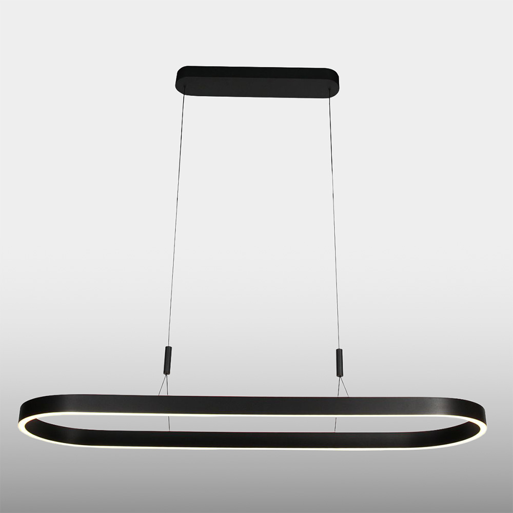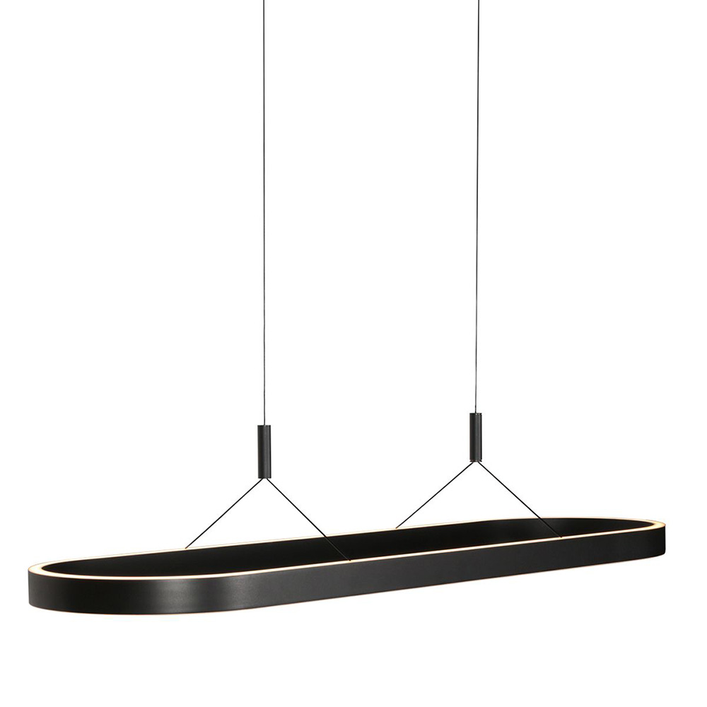 Deze moderne hanglamp is een echte eyecatcher boven de eettafel of in een vergaderruimte. De langwerpige, ovale vorm geeft het ontwerp een minimalistische uitstraling, terwijl de matzwarte afwerking zorgt voor een luxe en tijdloze look. Dankzij de geïntegreerde LED-verlichting verspreidt de lamp een aangenaam, warm licht dat zorgt voor sfeer én functionaliteit. Met de subtiele ophangkabels lijkt de lamp bijna te zweven, wat bijdraagt aan het elegante karakter van het ontwerp.