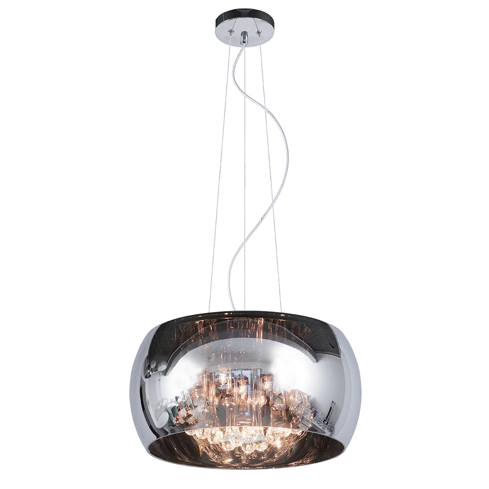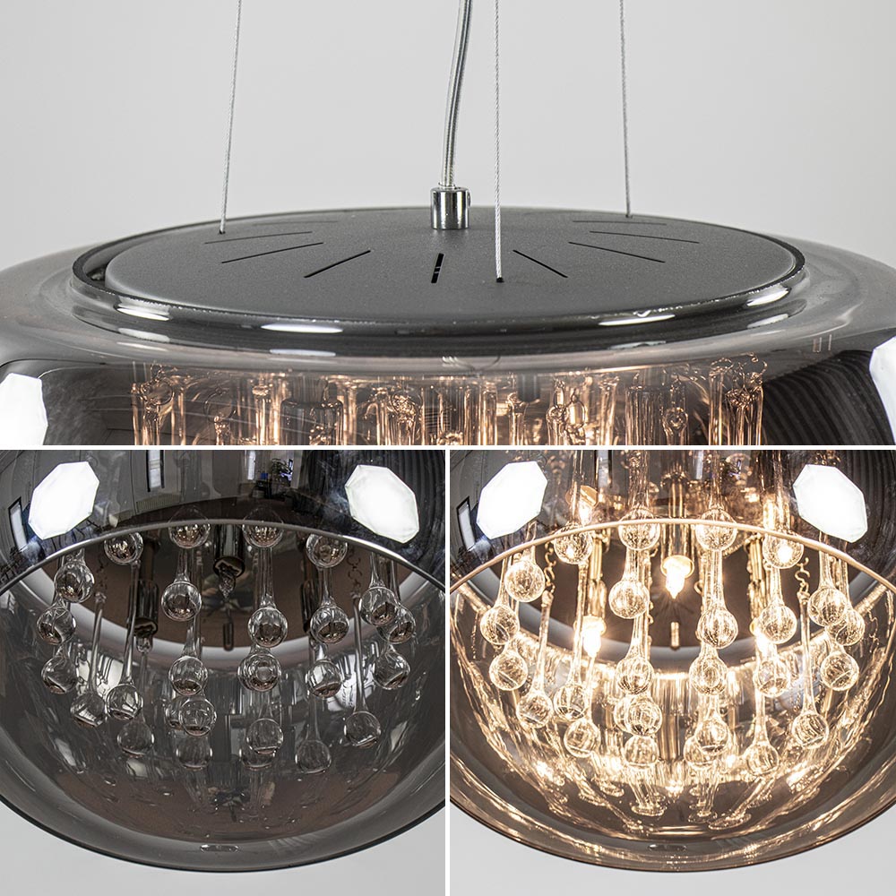 – hoogte: 160 cm (verstelbaar) – glazen kap heeft een Ø van 40 cm en een hoogte van 22 cm – bevestiging heeft een Ø van 11 cm en een hoogte van 2,5 cm – smoke glas/chroom – excl. lichtbron (5x G9) – dimbaar (exclusief)