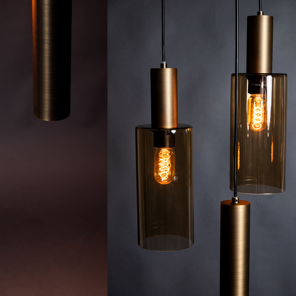 Belangrijkste kenmerken: • 3-lichts hanglamp met speelse hoogteverdeling • Bronskleurige pendels gecombineerd met amberkleurig glas • Rond plafondplateau voor een rustig en evenwichtig geheel • Warm, sfeervol licht naar beneden • Geschikt boven eettafel, ronde tafel of zithoek • Combinatie van E27- en GU10-fittingen