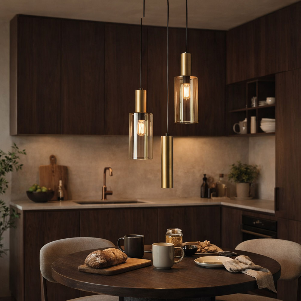 • Warme uitstraling door amberkleurig glas • Luxe combinatie van brons en metaal • Speelse pendels met rustige ronde plafondplaat • Mix van sfeer- en accentverlichting • Perfect boven een ronde tafel of zithoek