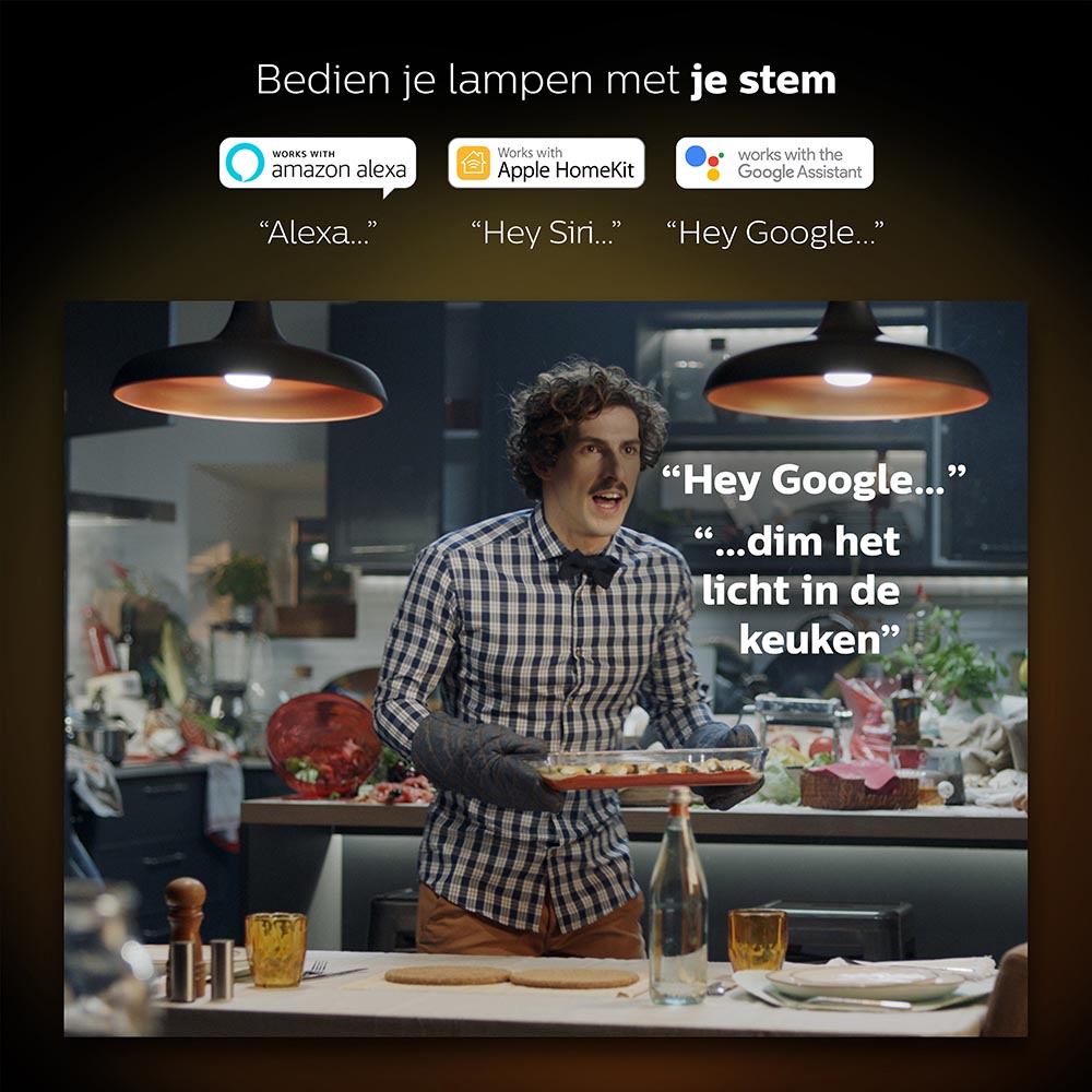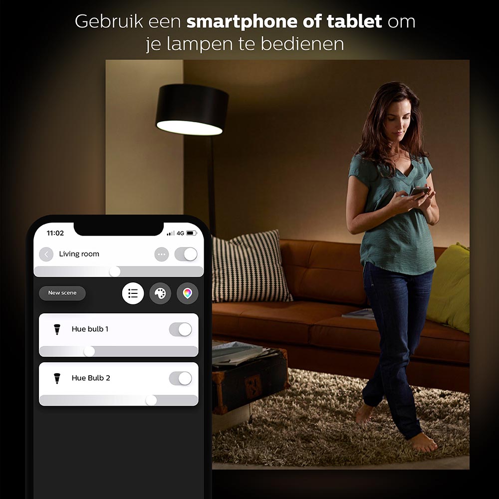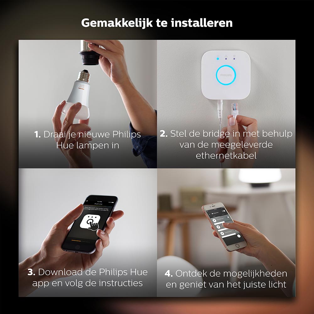 Gemakkelijk je verlichting regelen via internet? Dat kan met de Philips Hue white starter kit. Het pakket bevat 3 LED lampen, een Bridge en een dimmer. Hier kan overal ter wereld de lampen mee worden bediend, zolang er maar internet is. Bedien de lampen snel en slim via de Philips Bluetooth app op uw smartphone. Controleer of ze wel uitgeschakeld zijn of zet ze vast aan voordat u thuiskomt. Dit kan ook nog makkelijker dmv de timerfunctie. Is het licht net even te fel, geen probleem, met de dimmer maakt u snel de gewenste sfeer. Ook te bedienen met je stem via Google assistant of Alexa.