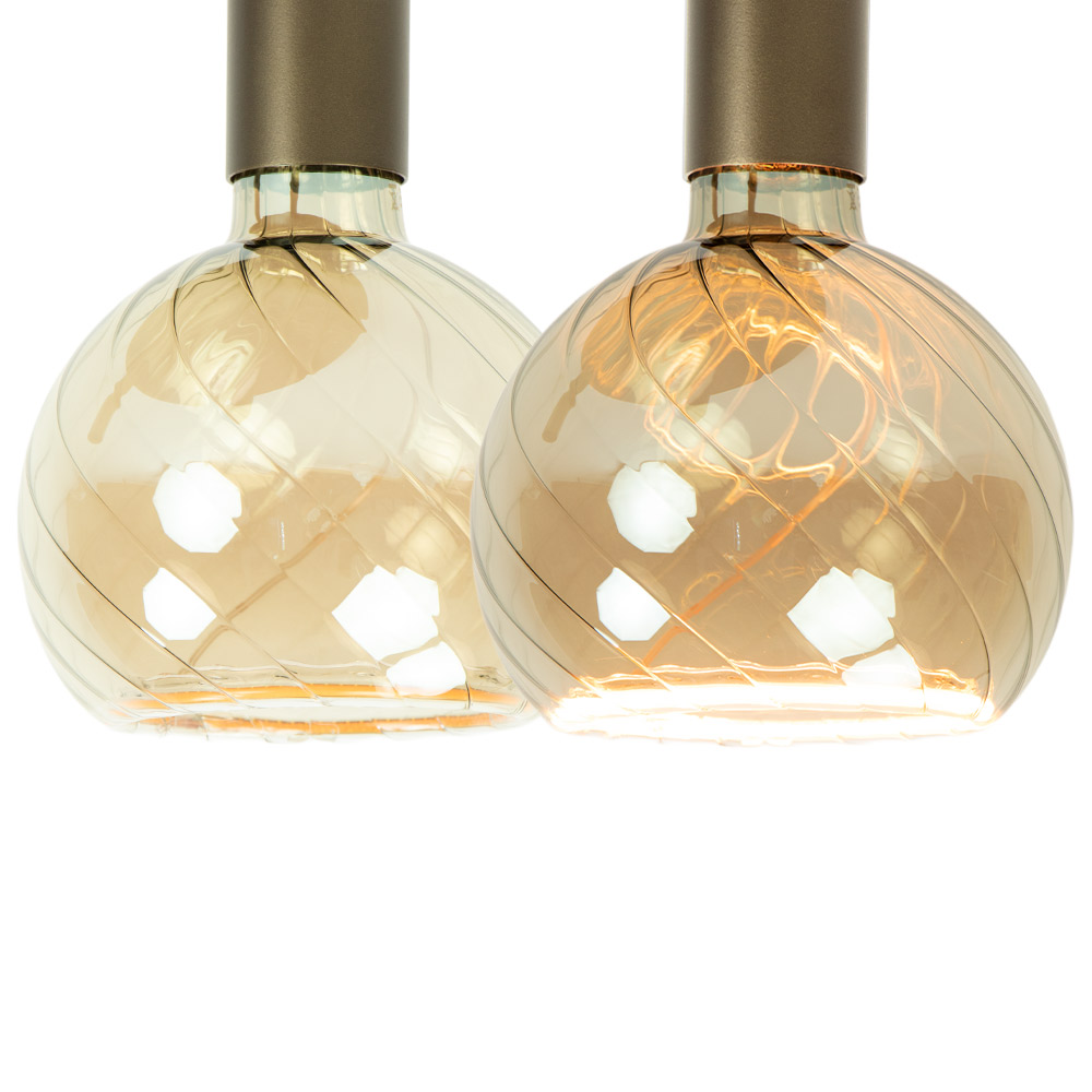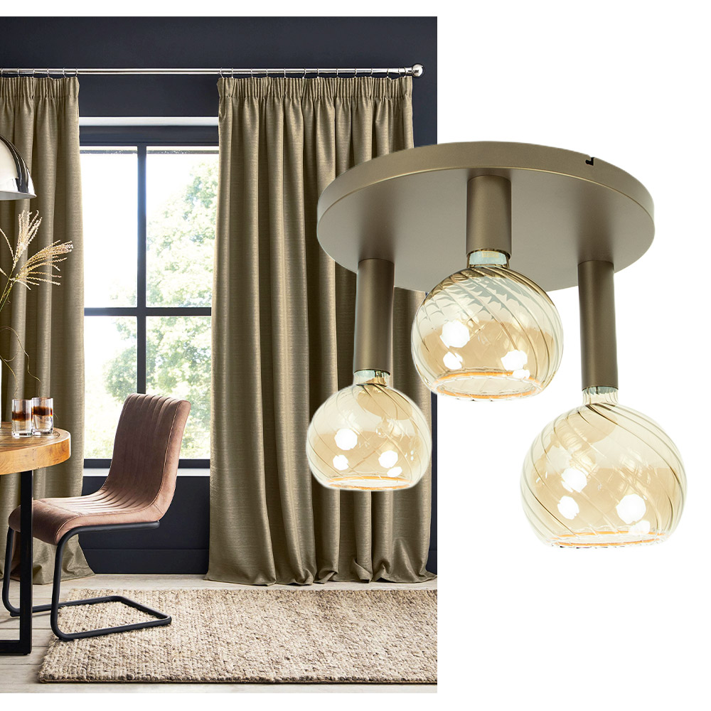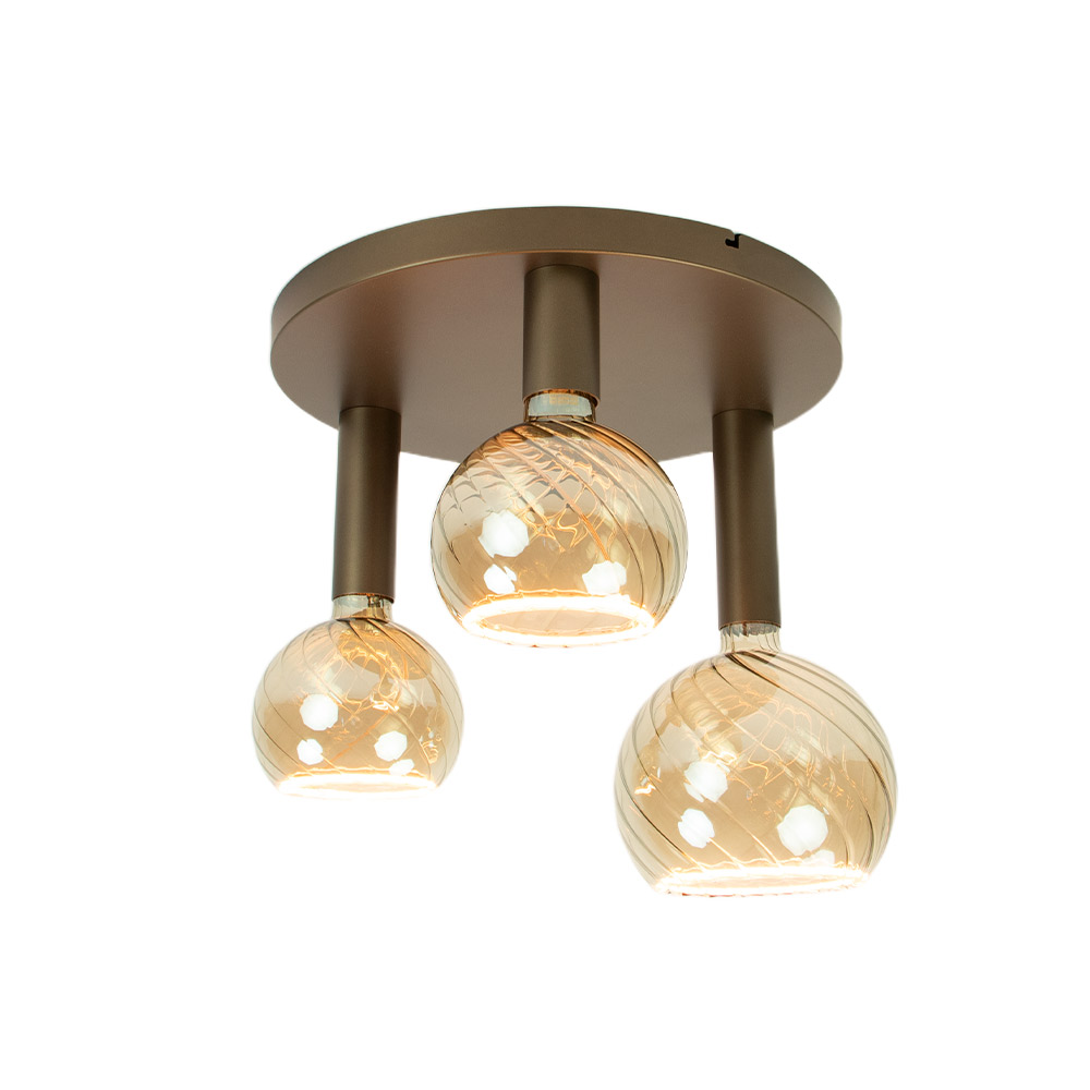 Deze plafondlamp is een mooie combinatie van verfijnde materialen en zachte tinten. De drie amberkleurige glazen bollen zijn voorzien van een subtiele draaiing in het glas, wat een dynamisch lichteffect geeft. Ze hangen aan een ronde plafondplaat in zachte goudkleur die rust en klasse uitstraalt.