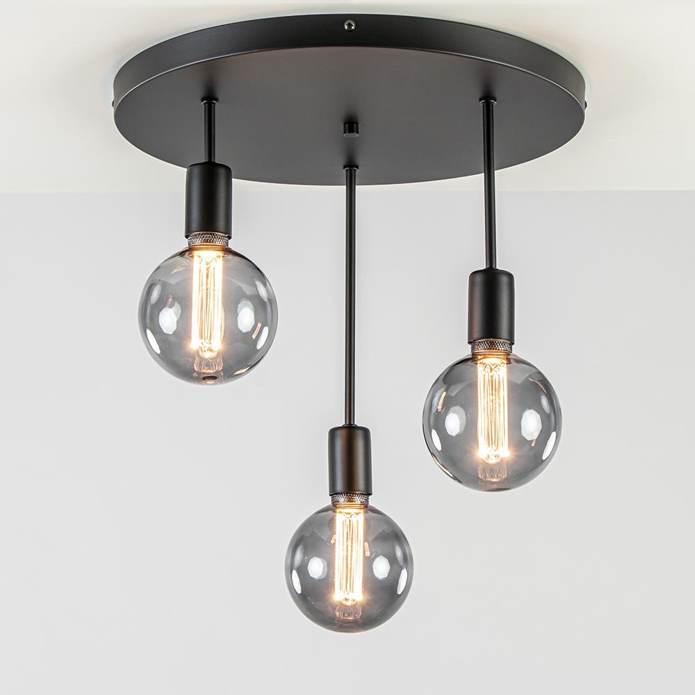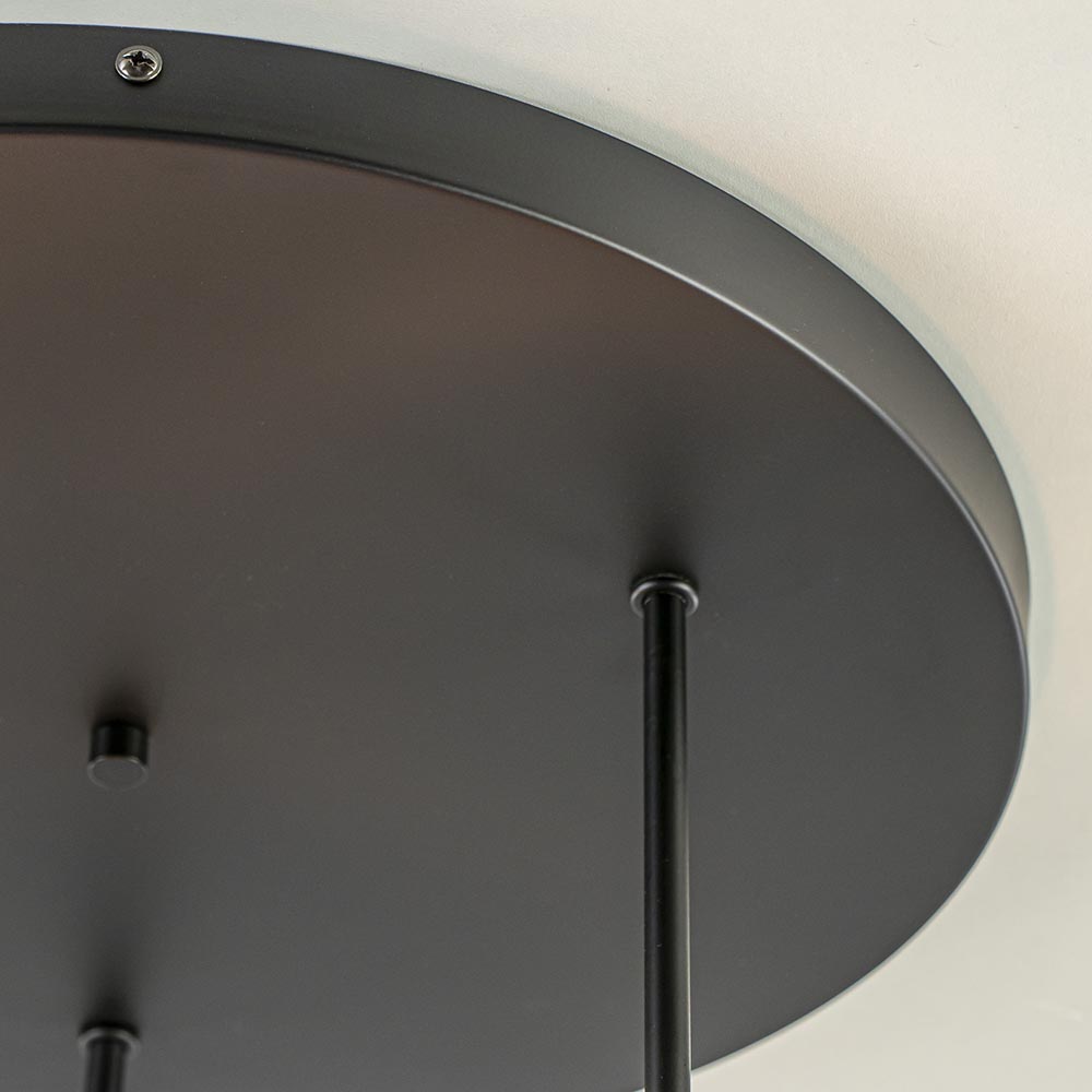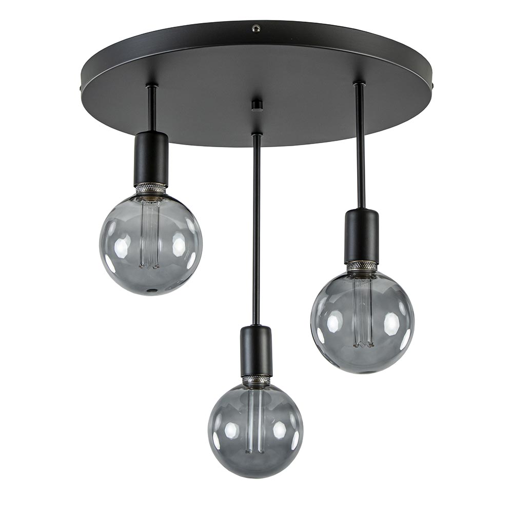 Een grove plafondplaat voorzien van E27 fittingen. U kunt zelf de sfeer bepalen van de lamp door de keuze van de lichtbronnen. Deze worden op diverse hoogtes in de fittingen geplaatst. De plaat heeft een doorsnede van 44 cm en de hoogte van de plafondlamp is 35,5 cm. Mooi voor in de hal, woonkamer of slaapkamer. De lichtbronnen zijn exclusief. De mat zwarte plafondlamp is dimbaar dmv een externe dimmer.