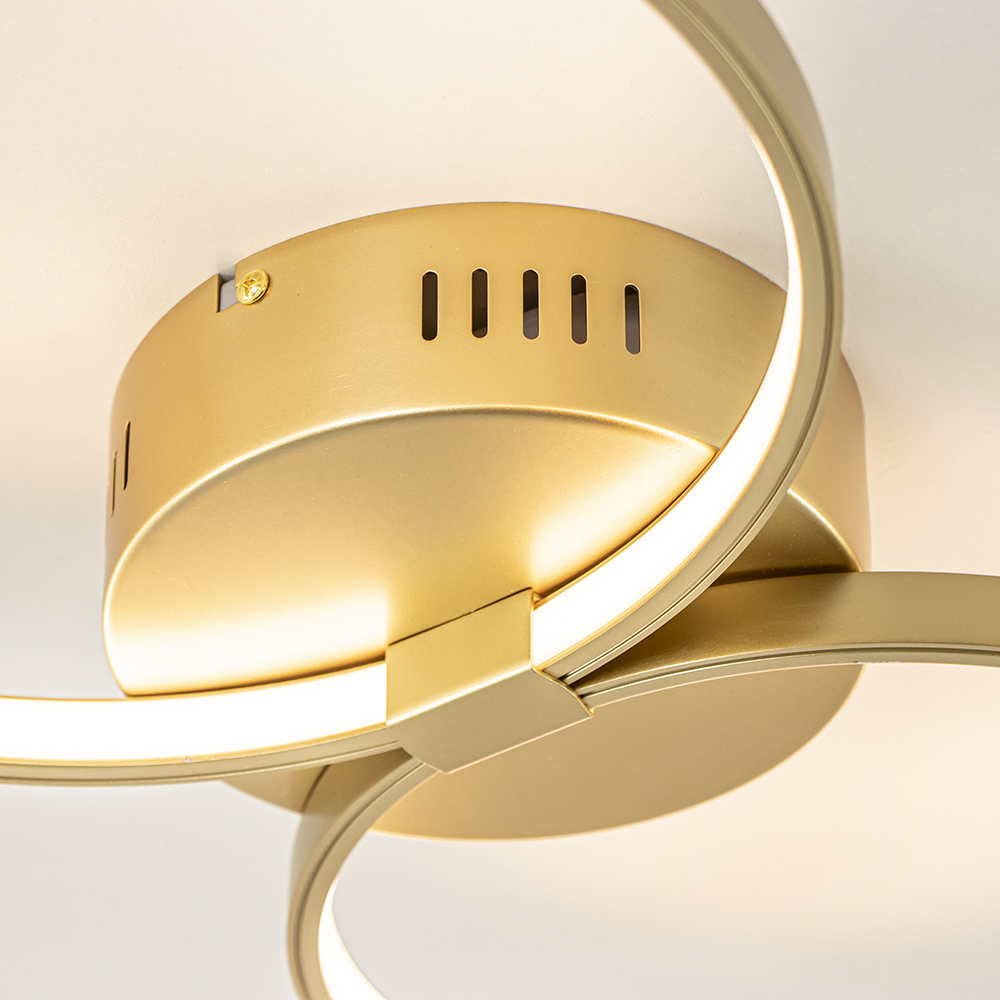 Een strak modern design met sfeervolle verlichting. Deze moderne plafonnière is voorzien van 4 ringen die op speelse wijze met elkaar zijn verbonden. Iedere ring is aan de binnenzijde voorzien van een LED strip die zorgt voor een fijne warm witte verlichting. Ideaal aan deze gouden plafondlamp is dat deze in 3-standen dimbaar is via de gewone wandschakelaar. U heeft hier dus geen externe dimmer voor nodig. Wanneer u de lamp inschakelt start deze op volledige intensiteit, schakelt u de lamp direct weer uit en aan, dan dimt deze naar een zachtere intensiteit. Doet u dit nogmaals dan is de LED lamp op zijn zachts gedimt. Zo creëert u gemakkelijk en snel de gewenste sfeer. De gouden plafondlamp past door z’n formaat mooi in een ruimte als de woonkamer, slaapkamer of hal.