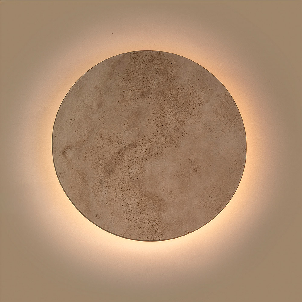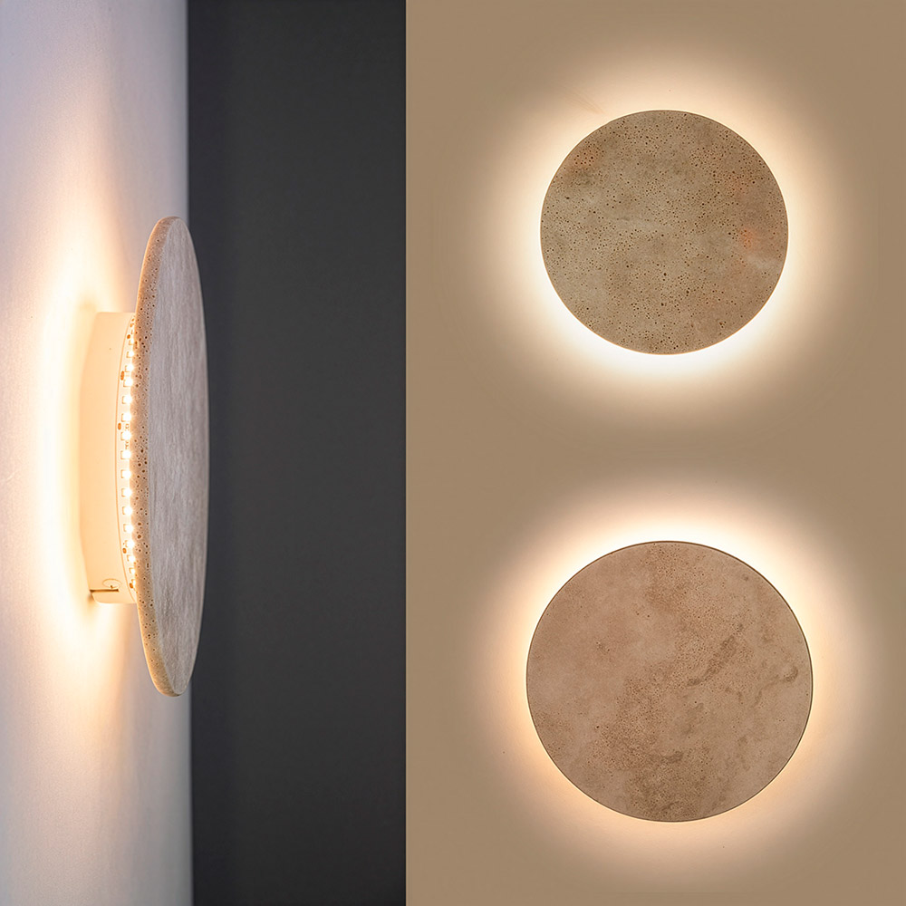 Dankzij de geïntegreerde LED-verlichting (2700K, 9W) straalt de Alysia een warme, subtiele lichtcirkel uit achter de stenen schijf. Via je normale wandschakelaar schakel je eenvoudig tussen drie lichtsterktes, ideaal voor zowel sfeer als functioneel licht. Perfect in de hal, woonkamer of als duo boven een dressoir voor een stijlvolle, warme uitstraling.