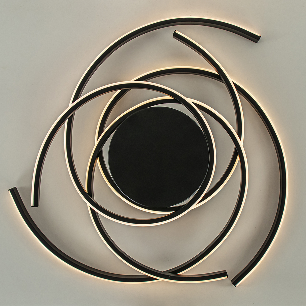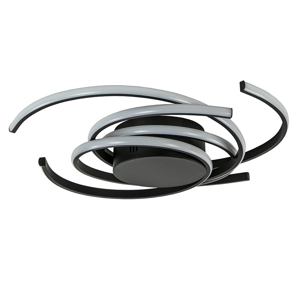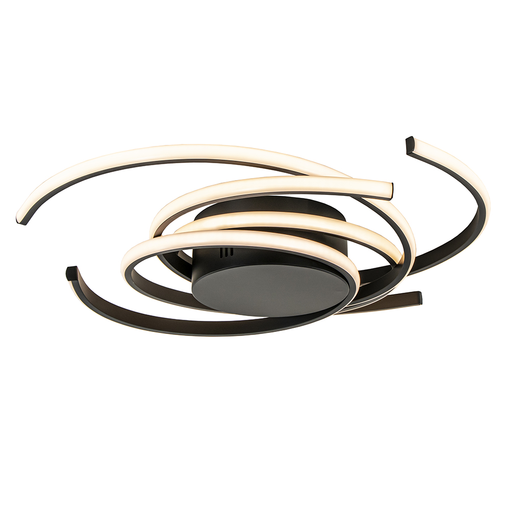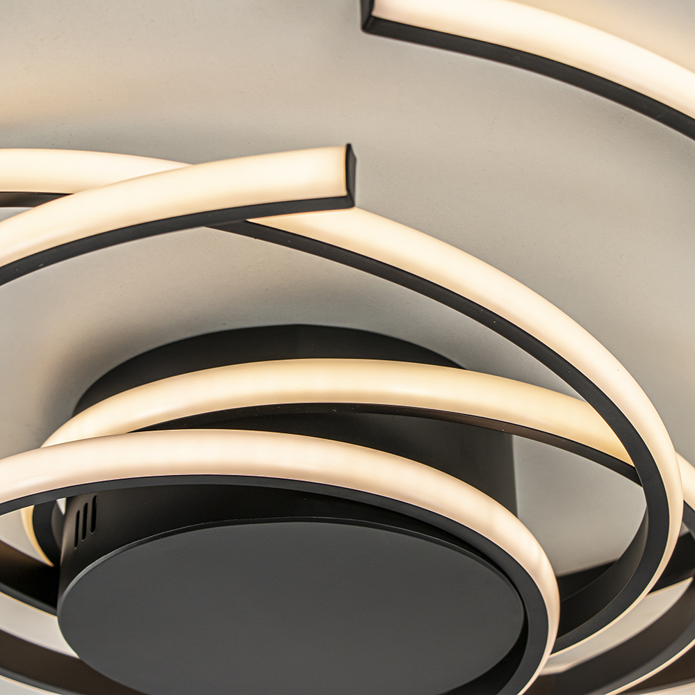 Modern van design en speels in uitvoering. Deze ronde LED plafondlamp heeft een zwart armatuur dat is voorzien van geïntegreerd LED. Dit is verdeeld over 3 ringen die deels los hangen. Doordat deze elkaar overlappen ontstaat er een speelse look. De moderne plafondlamp geeft met 2700 Kelvin een fijne warm witte verlichting die is te dimmen middels een externe dimmer (exclusief). De ronde LED lamp is een mooi toevoeging aan een hal, woonkamer of slaapkamer.
