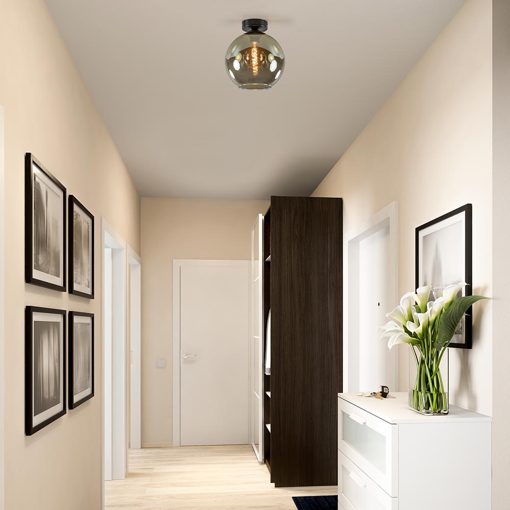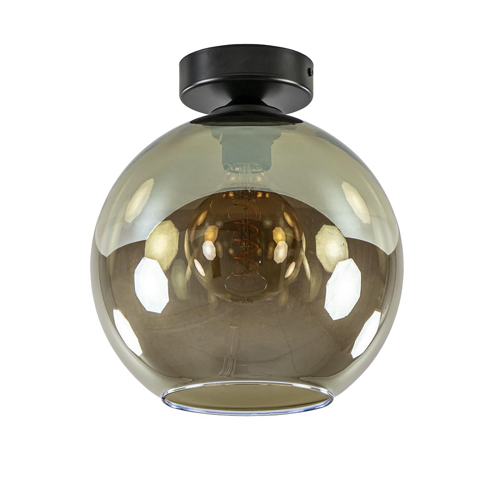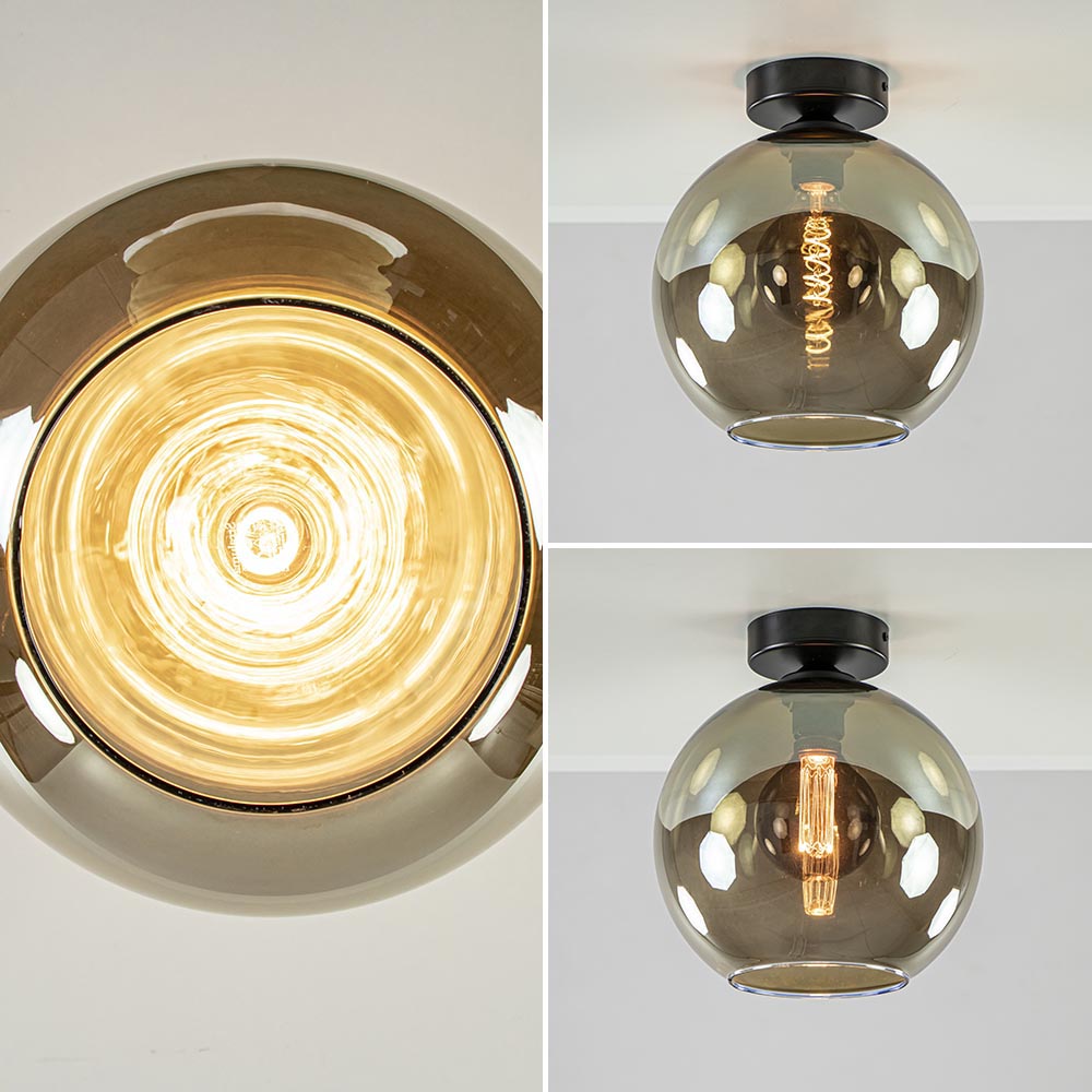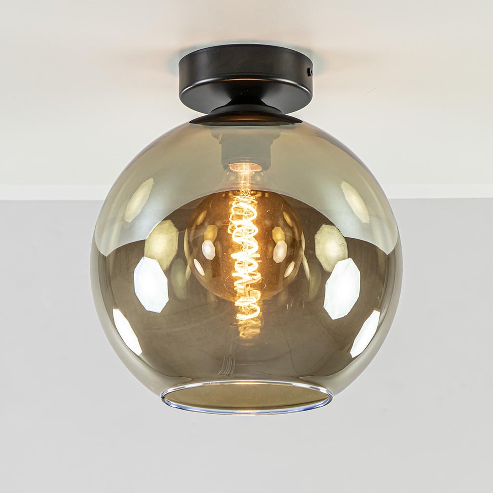Een chique plafondlamp met een luxe uitstraling. De plafondlamp heeft een smoke glazen bol als kap die wordt bevestigd op een zwart metalen bevestiging. Het donkere glas zorgt voor de luxe uitstraling en de combinatie met het zwart maakt de plafondlamp prima geschikt voor verschillende woonstijlen. De ronde plafondlamp is dimbaar middels een externe dimmer en wordt geleverd zonder lichtbron (E27). Ideaal voor in een hal, slaapkamer of woonkamer.