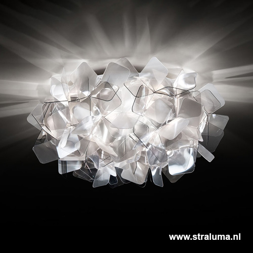 Een sprankelende design plafonnière of wandlamp. Ontworpen en geproduceerd in het mooie Italië. Deze prachtige plafondlamp vangt het licht in een wolk van transparante en semi transparante elementen. Doordat de elementen soms glad en soms een strak relief hebben, krijgt de plafonnière extra dimensie. De lamp heeft een prachtige rookkleur.