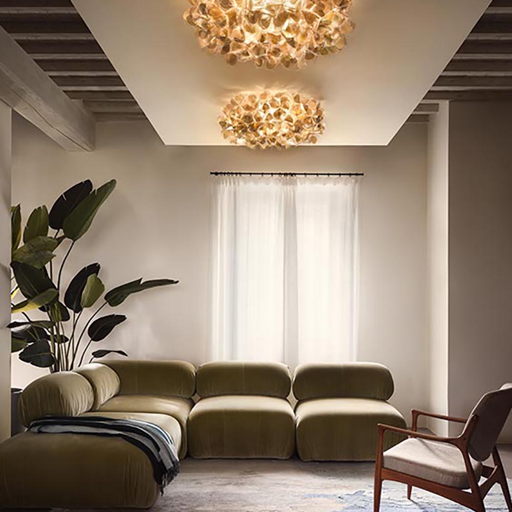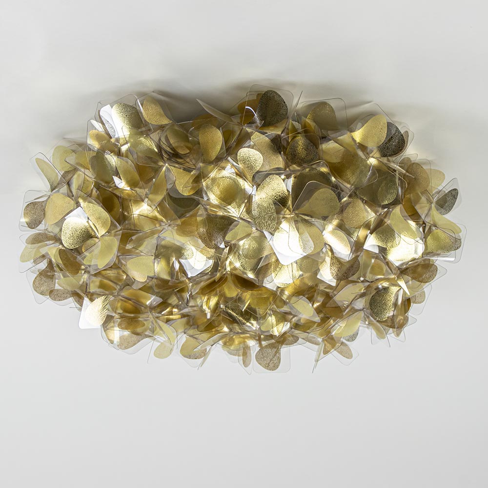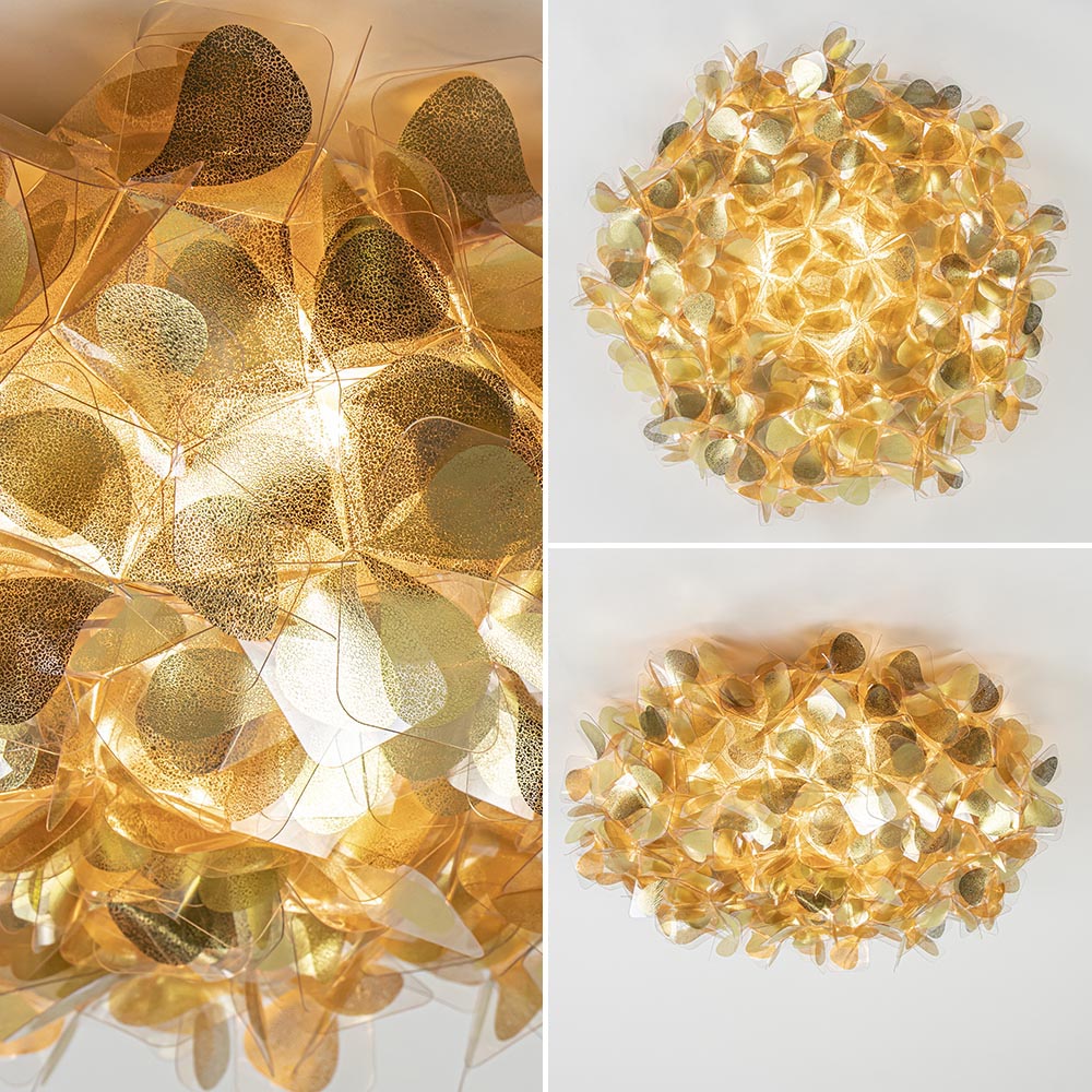 Een prachtig design dat volledig met de hand wordt samengesteld. De plafondlamp heeft een speels ontwerp dat met precisie wordt gemaakt. De ronde plafondlamp is uitgevoerd in het goud wat de lamp een extra luxueuze en glamoureuze uitstraling geeft. De lamp kan zowel worden toegepast als plafondlamp en wandlamp. De kap wordt met magneten op de bevestiging geplaatst. De kap is van binnen voorzien van 3 E27 lichtpunten.