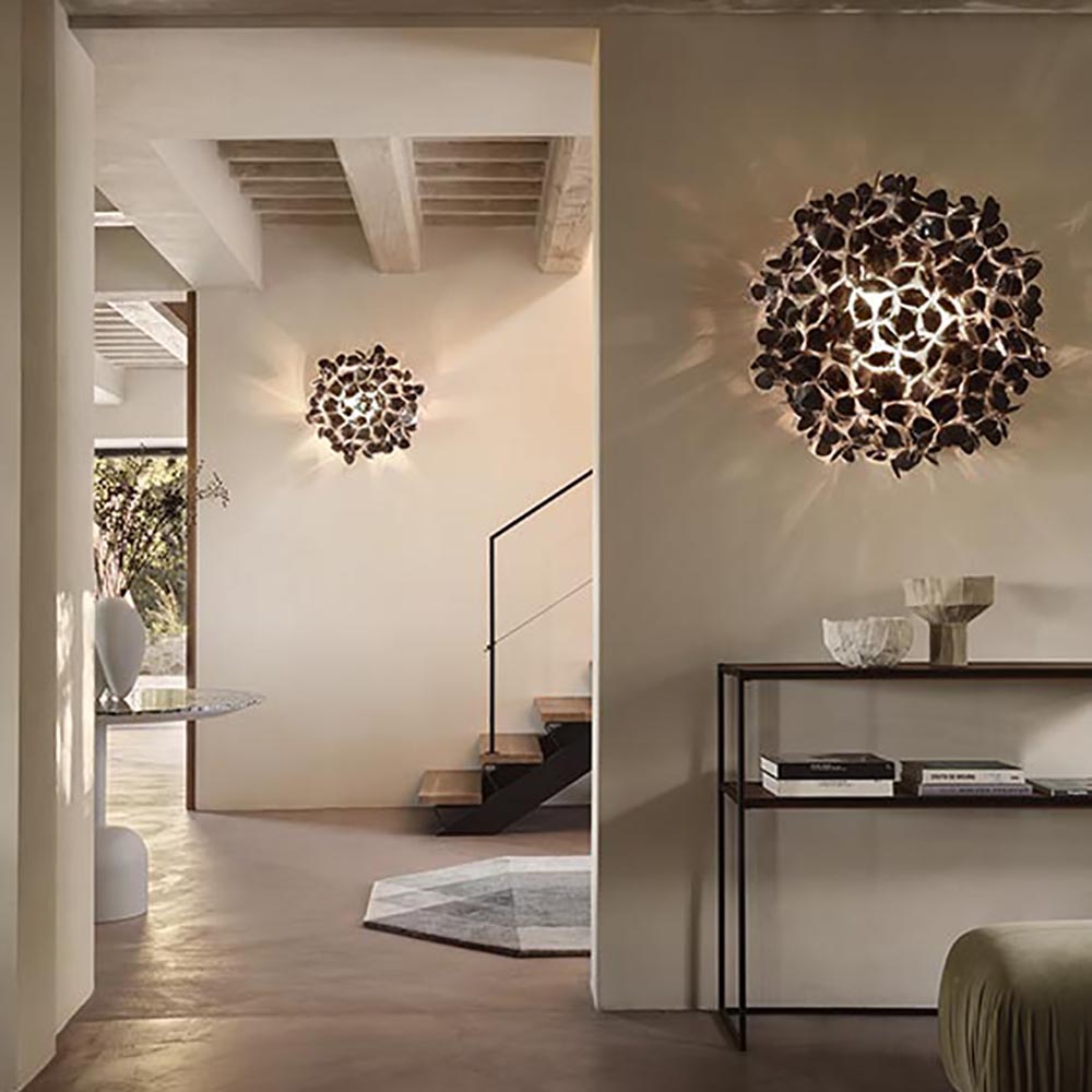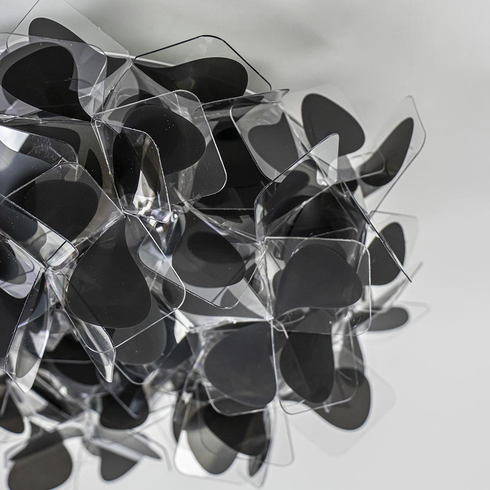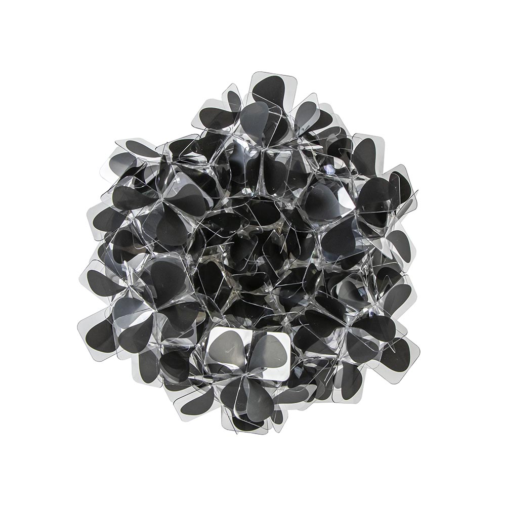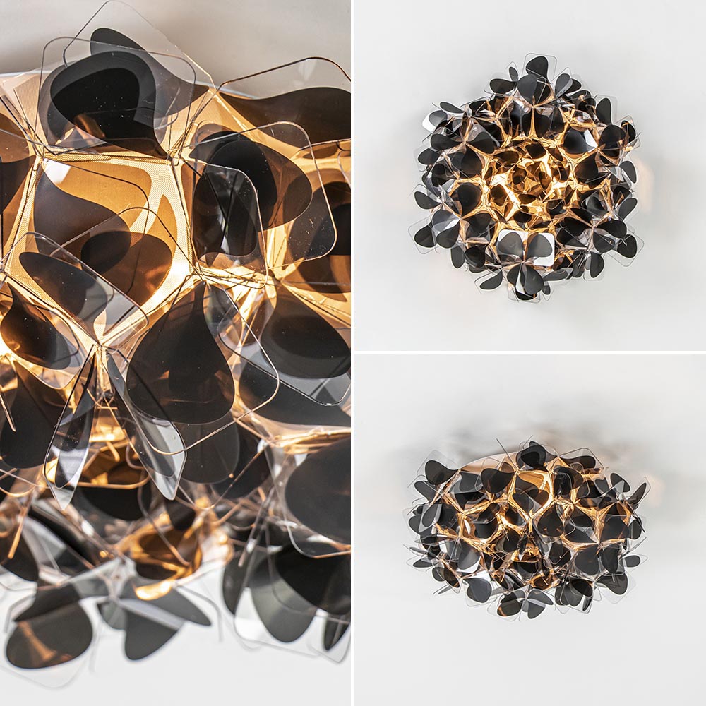 Een prachtig design dat volledig met de hand wordt samengesteld. De plafondlamp heeft een speels ontwerp dat met precisie wordt gemaakt. De ronde plafondlamp is uitgevoerd in het zwart wat de lamp een extra strakke en glamoureuze uitstraling geeft. De lamp kan zowel worden toegepast als plafondlamp en wandlamp. De kap wordt met magneten op de bevestiging geplaatst. De kap is van binnen voorzien van 2 E14 lichtpunten.
