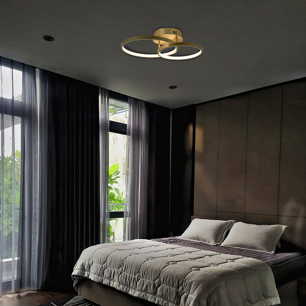 Ideaal voor in de hal of slaapkamer. Deze moderne plafondlamp heeft een strak design en zorgt met 2 LED ringen voor een prima lichtopbrengst. Het armatuur is gemaakt van metaal en uitgevoerd in het goud. Dit geeft de lamp een trendy look die mooi is te combineren in diverse woonstijlen. De 2 ringen zijn beide voorzien van geïntegreerd LED en geven met 2700 Kelvin een sfeervolle warm witte verlichting. De plafondlamp double rings is dimbaar middels een externe dimmer (exclusief).
