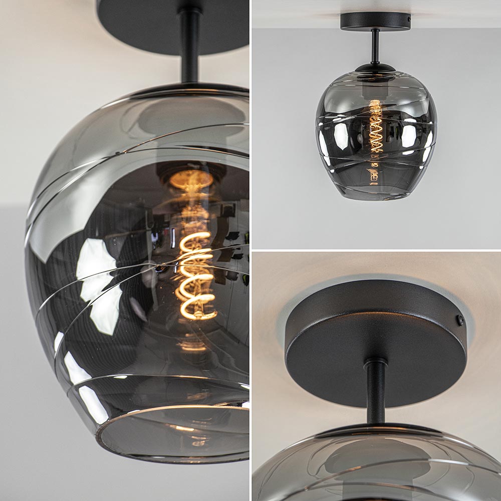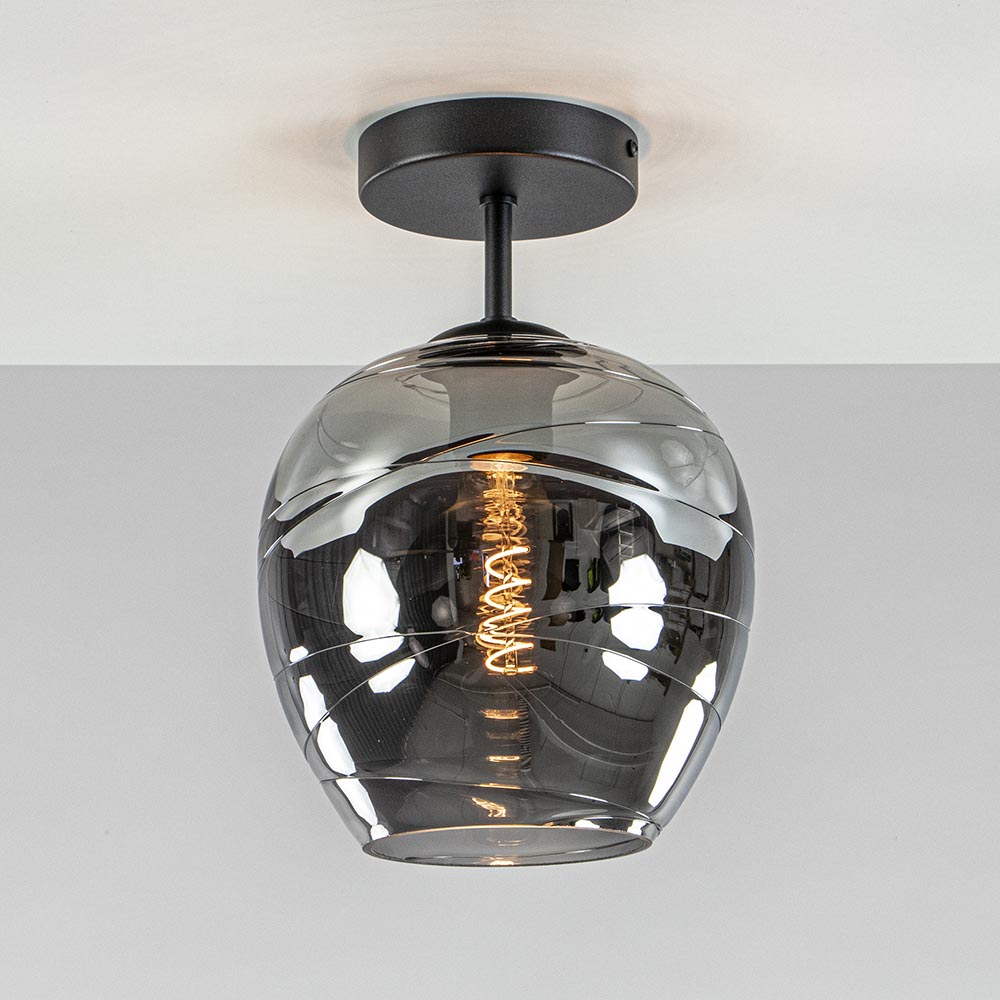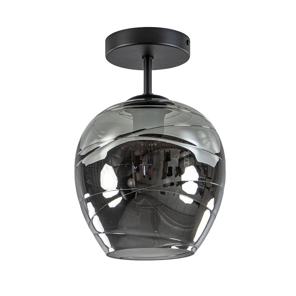 Een moderne plafondlamp met een luxe uitstraling. De zwarte plafondlamp is voorzien van een smoke glazen kap met een spiegelend effect. Zodra de lamp is uitgeschakeld spiegeld het glas z’n omgeving, schakelt u de lamp in, dan wordt het glas smoke, oftewel donker transparant. Dit effect zorgt voor de luxe uitstraling van de lamp en wordt versterkt door de vorm van het glas. De smoke glazen kap zit bevestigd op de metalen fitting die verder doorloopt in de zwarte plafondbevestiging. De moderne plafondlamp leent zich prima voor een ruimte als de hal, toilet of slaapkamer. De smokey plafondlamp wordt geleverd zonder lichtbron (E27).