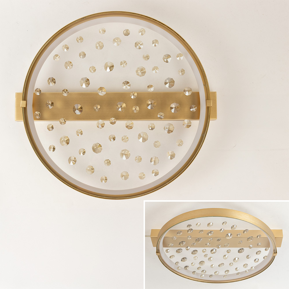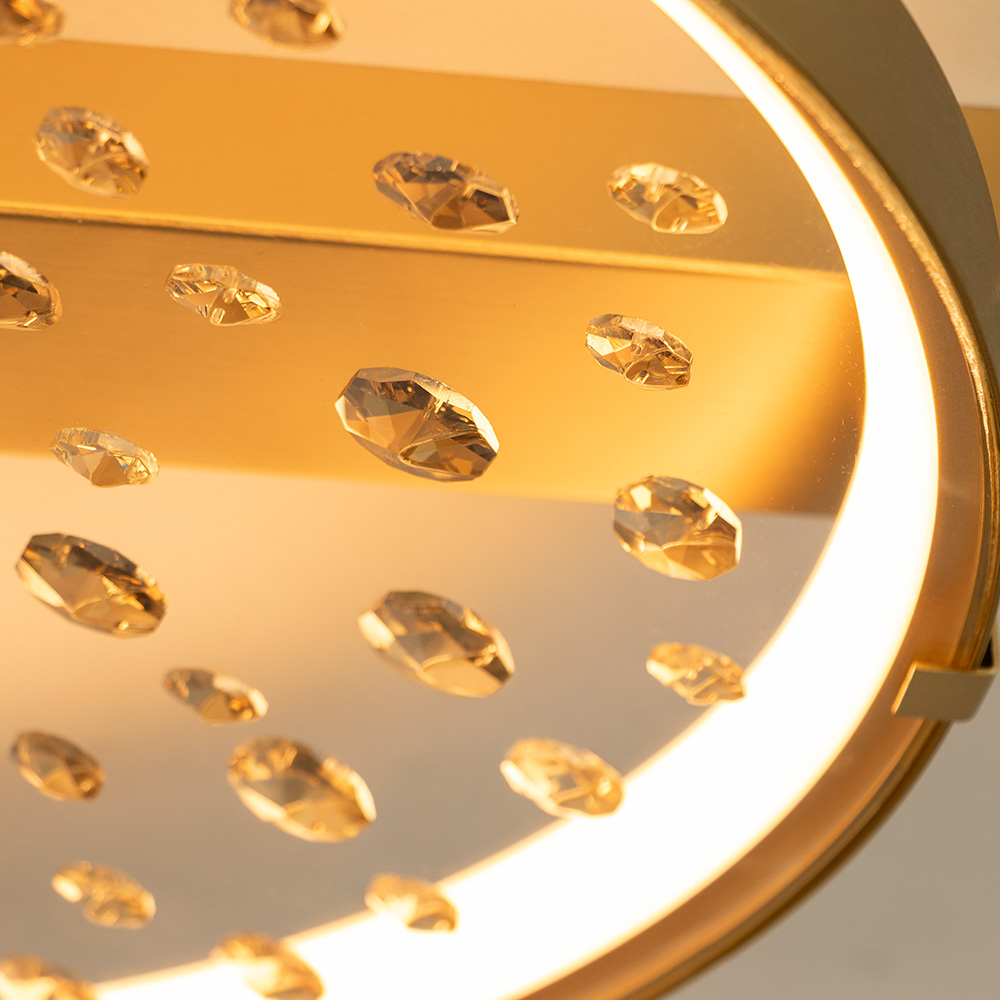 Breng een vleugje luxe in je interieur met deze stijlvolle plafondlamp. De combinatie van een matte gouden ring en fonkelende steentjes accenten zorgt voor een chique uitstraling. Dankzij de geïntegreerde LED-verlichting geeft de lamp een warme gloed, die prachtig weerkaatst in de geslepen steentjes en een sprankelend lichteffect creëert. Deze plafondlamp is niet alleen een praktische lichtbron, maar ook een echte eyecatcher. Perfect voor in de hal, slaapkamer of woonkamer – overal waar je een elegant accent wilt toevoegen. Door het compacte, platte ontwerp is de lamp bovendien ideaal voor ruimtes met een lagere plafondhoogte.