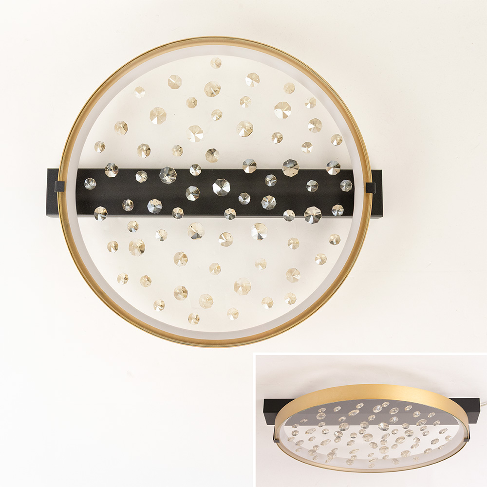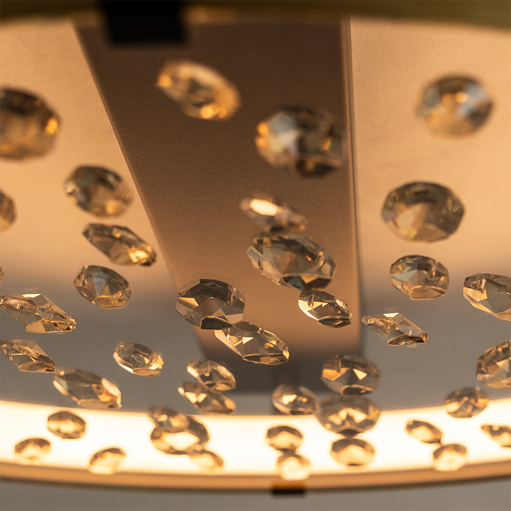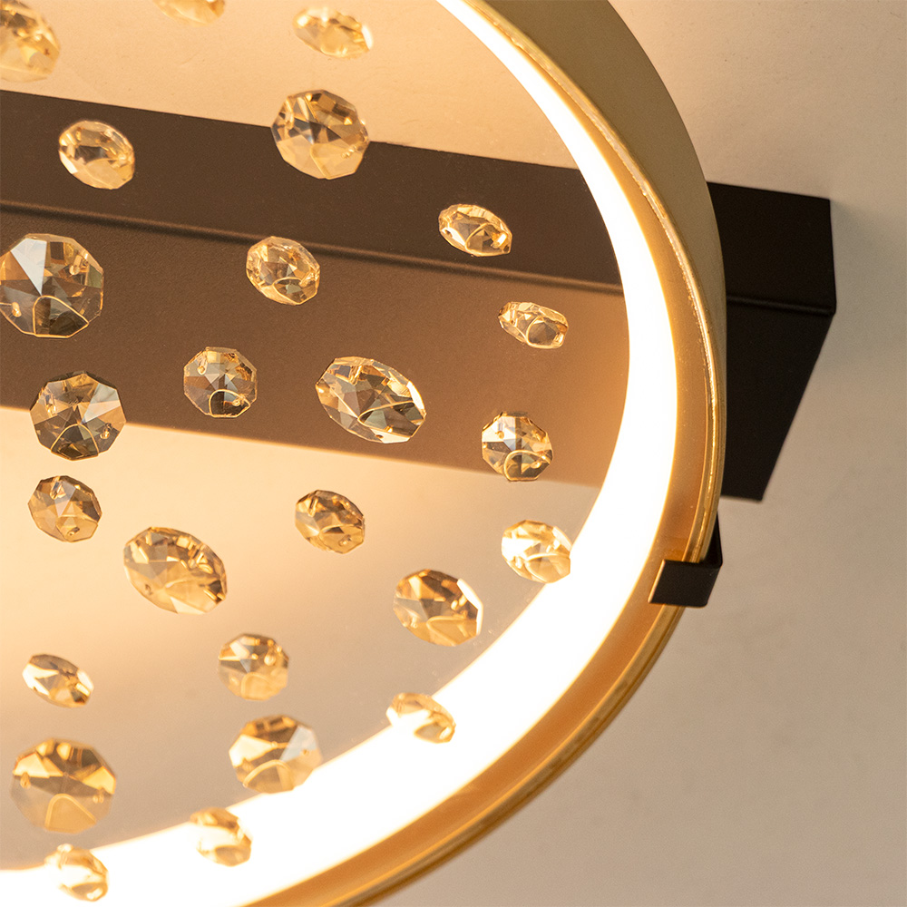 Breng een vleugje luxe in je interieur met deze stijlvolle plafondlamp. De combinatie van een matte gouden ring, een zwarte basis en fonkelende steentjes accenten zorgt voor een chique uitstraling. Dankzij de geïntegreerde LED-verlichting geeft de lamp een warme gloed, die prachtig weerkaatst in de geslepen steentjes en een sprankelend lichteffect creëert. Deze plafondlamp is niet alleen een praktische lichtbron, maar ook een echte eyecatcher. Perfect voor in de hal, slaapkamer of woonkamer – overal waar je een elegant accent wilt toevoegen. Door het compacte, platte ontwerp is de lamp bovendien ideaal voor ruimtes met een lagere plafondhoogte.