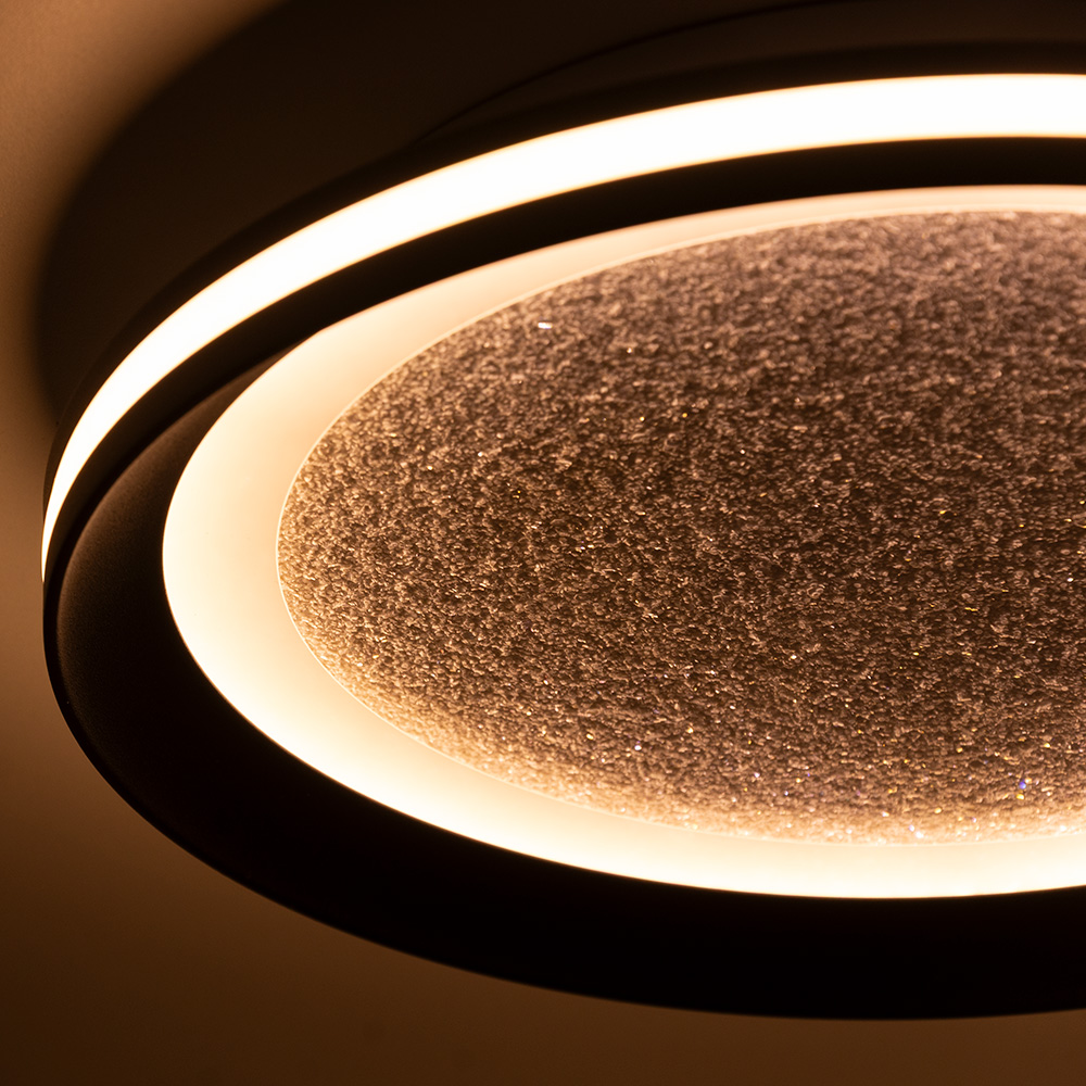 Plafondlamp Glitter Disc is een stijlvol statement voor elk interieur. De ronde vorm met zwarte accenten en de subtiel glinsterende binnenzijde zorgen voor een luxe en moderne uitstraling. Wanneer de geïntegreerde LED-verlichting inschakelt, ontstaat er een prachtig lichtspel dat de ruimte op sfeervolle wijze verlicht. De lamp is voorzien van 3 standen dimbaar LED-licht, eenvoudig te bedienen via de wandschakelaar. Zo wissel je moeiteloos tussen helder licht voor functionele momenten en warm, zacht licht voor een gezellige sfeer.