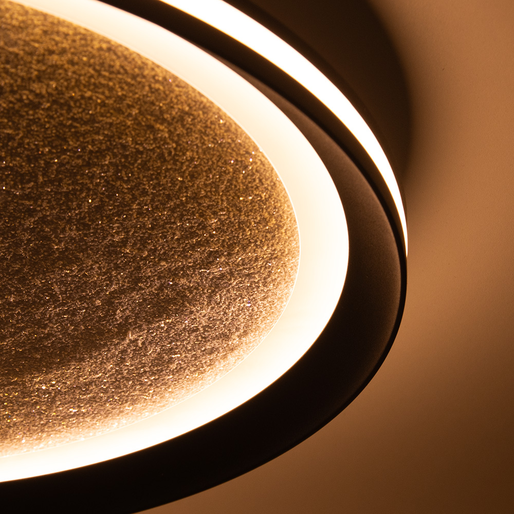 Plafondlamp Glitter Disc is een stijlvol statement voor elk interieur. De ronde vorm met zwarte accenten en de subtiel glinsterende binnenzijde zorgen voor een luxe en moderne uitstraling. Wanneer de geïntegreerde LED-verlichting inschakelt, ontstaat er een prachtig lichtspel dat de ruimte op sfeervolle wijze verlicht. De lamp is voorzien van 3 standen dimbaar LED-licht, eenvoudig te bedienen via de wandschakelaar. Zo wissel je moeiteloos tussen helder licht voor functionele momenten en warm, zacht licht voor een gezellige sfeer.