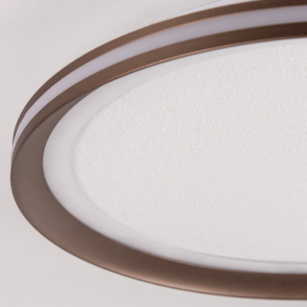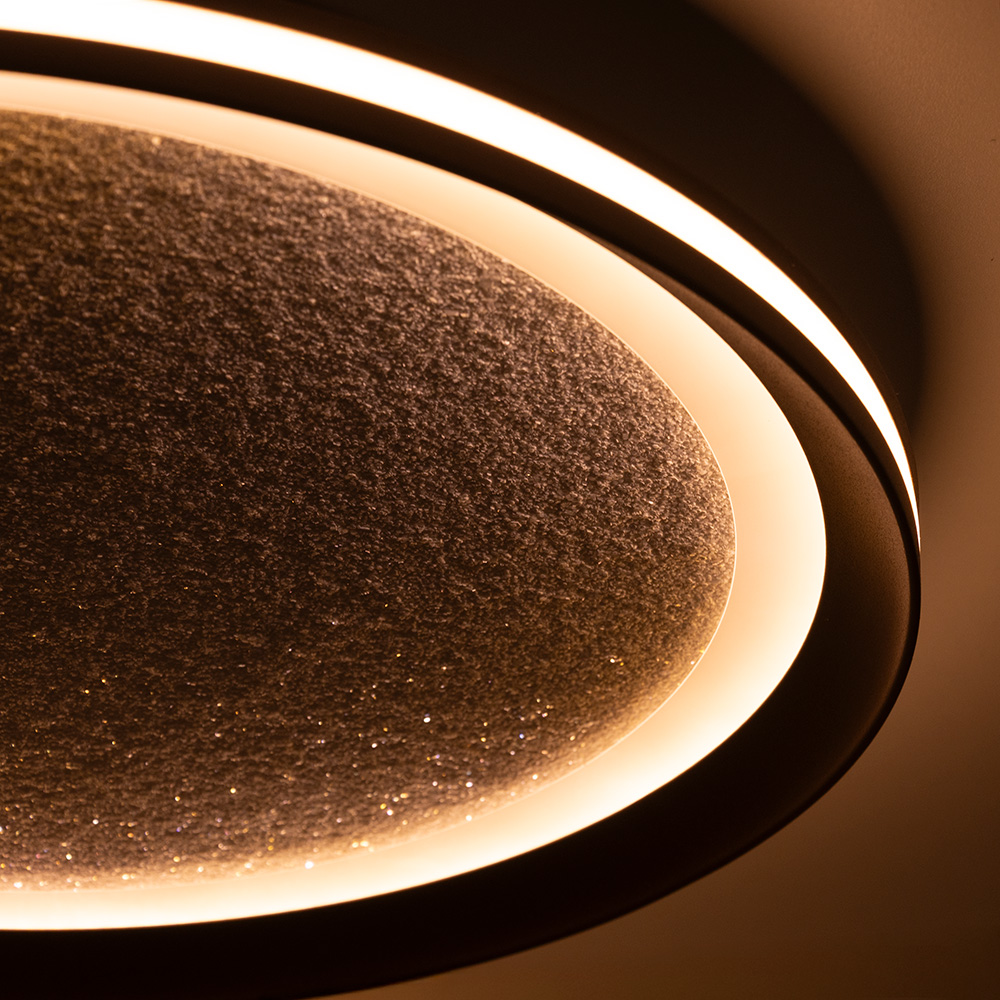 Plafondlamp Glitter Disc is een stijlvol statement voor elk interieur. De ronde vorm met cappuccino kleurige accenten en de subtiel glinsterende binnenzijde zorgen voor een luxe en moderne uitstraling. Wanneer de geïntegreerde LED-verlichting inschakelt, ontstaat er een prachtig lichtspel dat de ruimte op sfeervolle wijze verlicht. De lamp is voorzien van 3 standen dimbaar LED-licht, eenvoudig te bedienen via de wandschakelaar. Zo wissel je moeiteloos tussen helder licht voor functionele momenten en warm, zacht licht voor een gezellige sfeer.