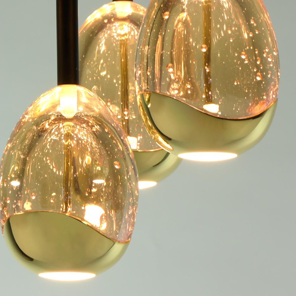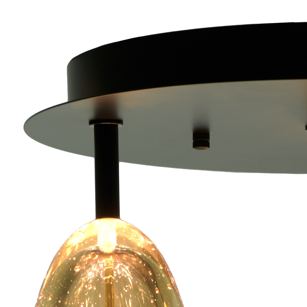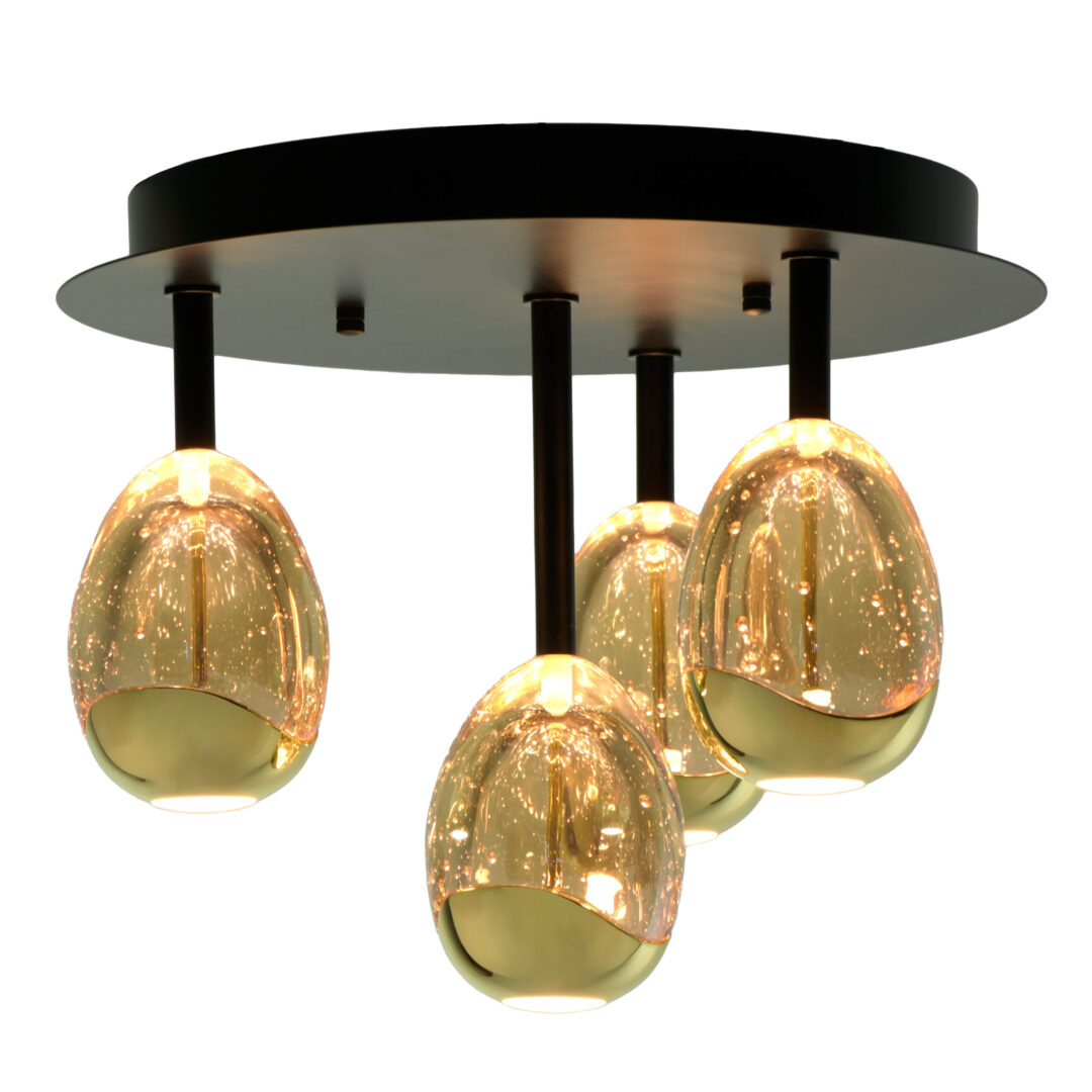 Een moderne eyecatcher met een speelse twist! Deze unieke plafondlamp combineert een strak zwart armatuur met vier eivormige glazen bollen uitgevoerd in amberkleurig glas met luchtbel-effect. Het resultaat is een chique, sfeervolle lamp die een sprankelend lichtspel op het plafond creëert. De combinatie van gouden details en bubbeltjesglas zorgt voor een warme uitstraling met een luxe gevoel. Perfect voor in de hal, slaapkamer of boven de eettafel als stijlvol statement.