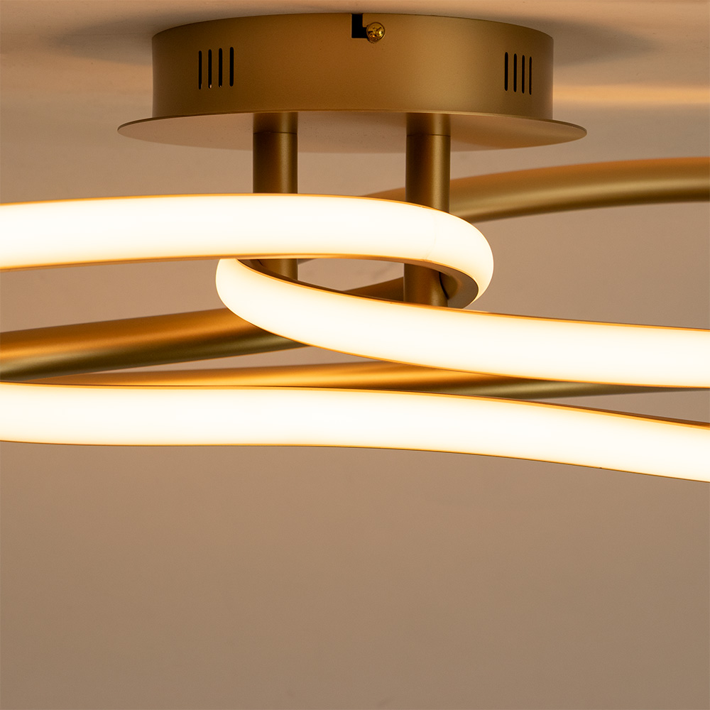 Deze plafondlamp is een echte blikvanger en brengt sfeer en stijl in elk interieur. Het ontwerp bestaat uit elegante, goudkleurige lijnen die sierlijk in elkaar verweven zijn en een dynamisch, vloeiend patroon vormen. De ingebouwde LED-verlichting zorgt voor een warme, uitnodigende uitstraling, terwijl het goudkleurige armatuur een luxe en eigentijdse uitstraling toevoegt aan elke kamer. Dankzij het verfijnde en subtiele design creëert deze plafondlamp een unieke ambiance en een stijlvolle uitstraling in uw woonruimte. Perfect geschikt voor zowel moderne als klassieke interieurs, biedt deze lamp niet alleen praktische verlichting, maar ook een opvallend decoratief element aan het plafond.