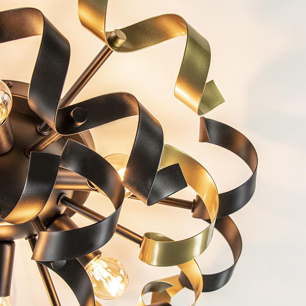 Decoratief, sfeervol en speels inéén. Deze ronde plafondlamp heeft een uniek design en is mooi te combineren in diverse woonstijlen. De plafondlamp is gemaakt van metaal en uitgevoerd in het mat zwart met goud. De kap is samengesteld uit diverse krullen die ieder apart aan de bevestiging vast zitten. Doordat de krullen ook door elkaar lopen ontstaat er een grafisch lijnenspel. Onder de krullen zit de bevestiging die is voorzien van E14 lichtpunten. Doordat de ruimte wat beperkter is passen kleine kogellampjes het beste in de plafondlamp. Deze zijn exclusief. De mat zwarte plafondlamp met goud is dimbaar middels een externe dimmer (exclusief).