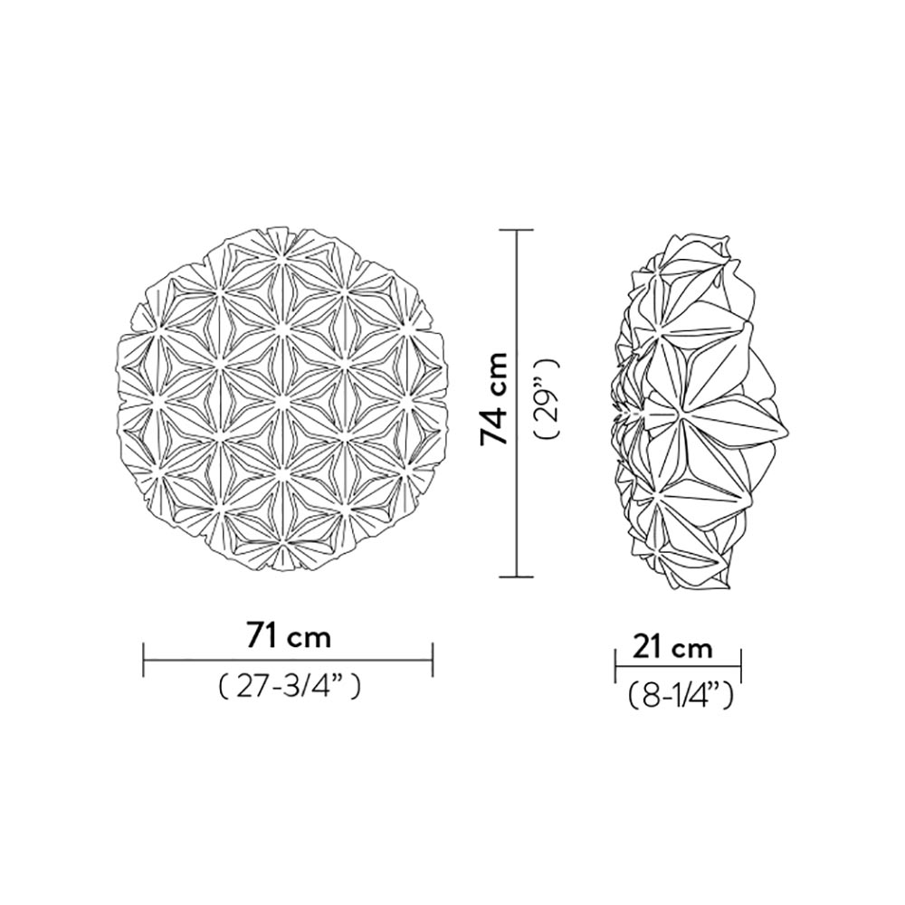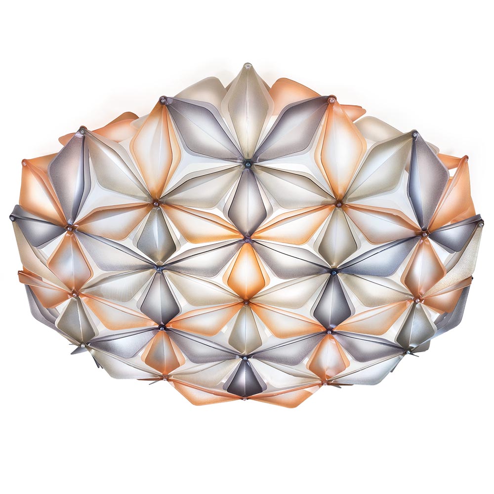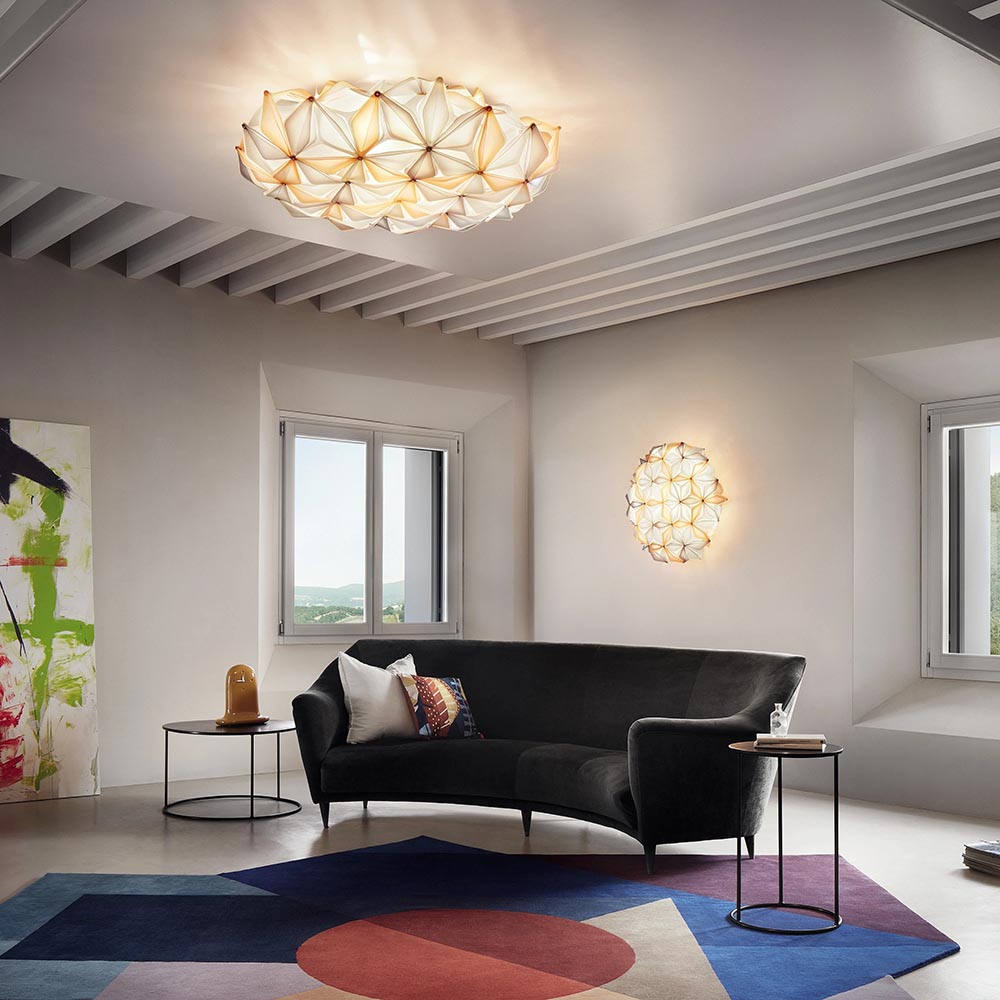 Geïnspireerd op de ‘flower of life’, maakt dat deze plafondlamp een uniek ontwerp heeft waar de bloem mooi is terug te vinden. De design lamp bestaat uit diverse ‘blaadjes’ die samen het geheel vormen. De ronde lamp is zowel als plafond- en wandlamp te gebruiken. De kap wordt gemakkelijk op de bevestiging geplaatst met magneetjes. Plafondlamp La Vie is verkrijgbaar in divere kleuren en wordt geleverd zonder lichtbron (3x E27)