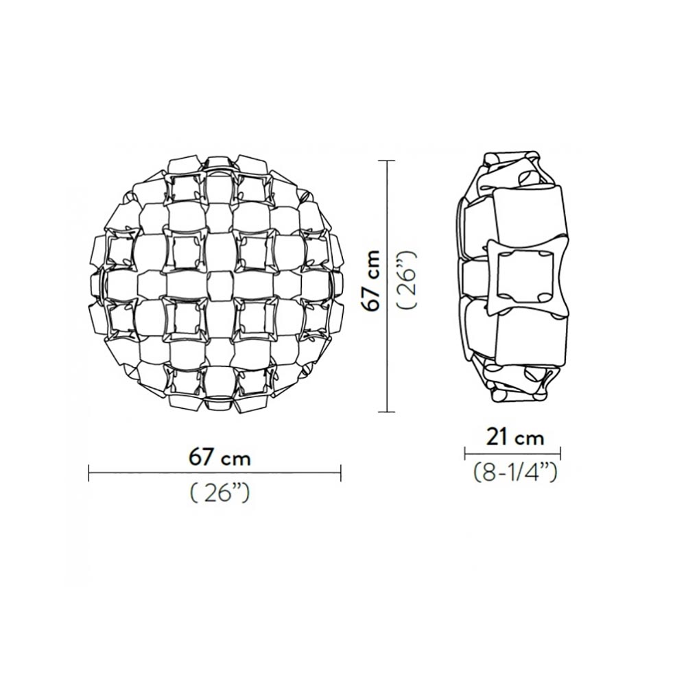 – hoogte van de lamp is 21 cm – Ø van de lamp is 67 cm – bevestiging heeft een afmeting van Ø37×0,2 cm – magnetische ophangsysteem – exclusief lichtbron (4x E27, geschikt voor LED)