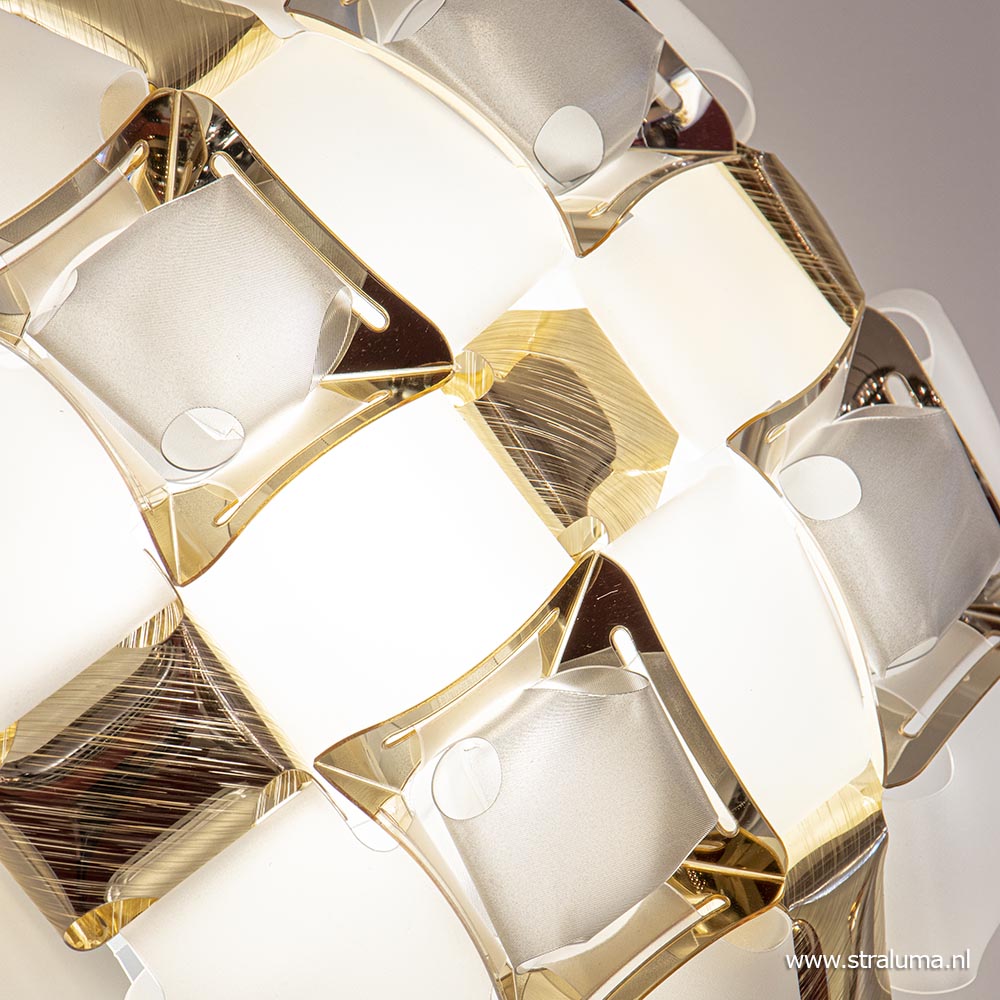 Design, luxe, en glamour in één. De design lamp is geïnspireerd op juwelen uit de haute couture en doet dan ook denken aan edelstenen en diamanten. De geometrische kap bestaat uit losse elementen die samen de kap vormen en zijn gemaakt van opalflex en lentiflex, beide materialen die zorgen voor de extra luxe uitstraling. De kap wordt met een magnetisch ophangsysteem aan de bevestiging opgehangen en de lamp is geschikt voor zowel het plafond als de muur. Waar deze Italiaanse designlamp ook komt te hangen, het geeft meteen sfeer, luxe en vooral glamour aan het interieur.