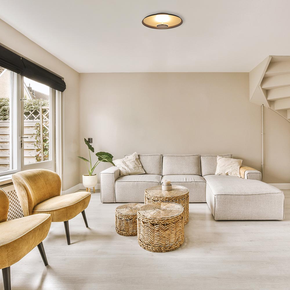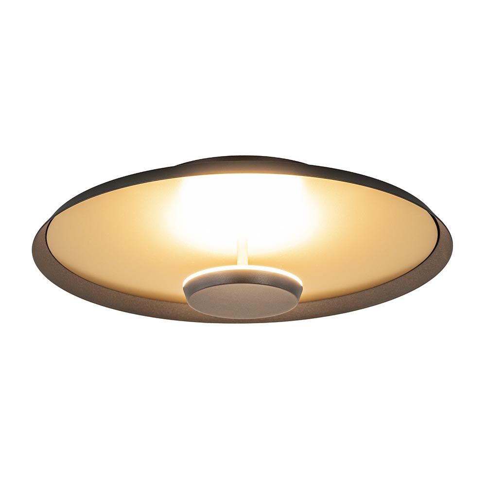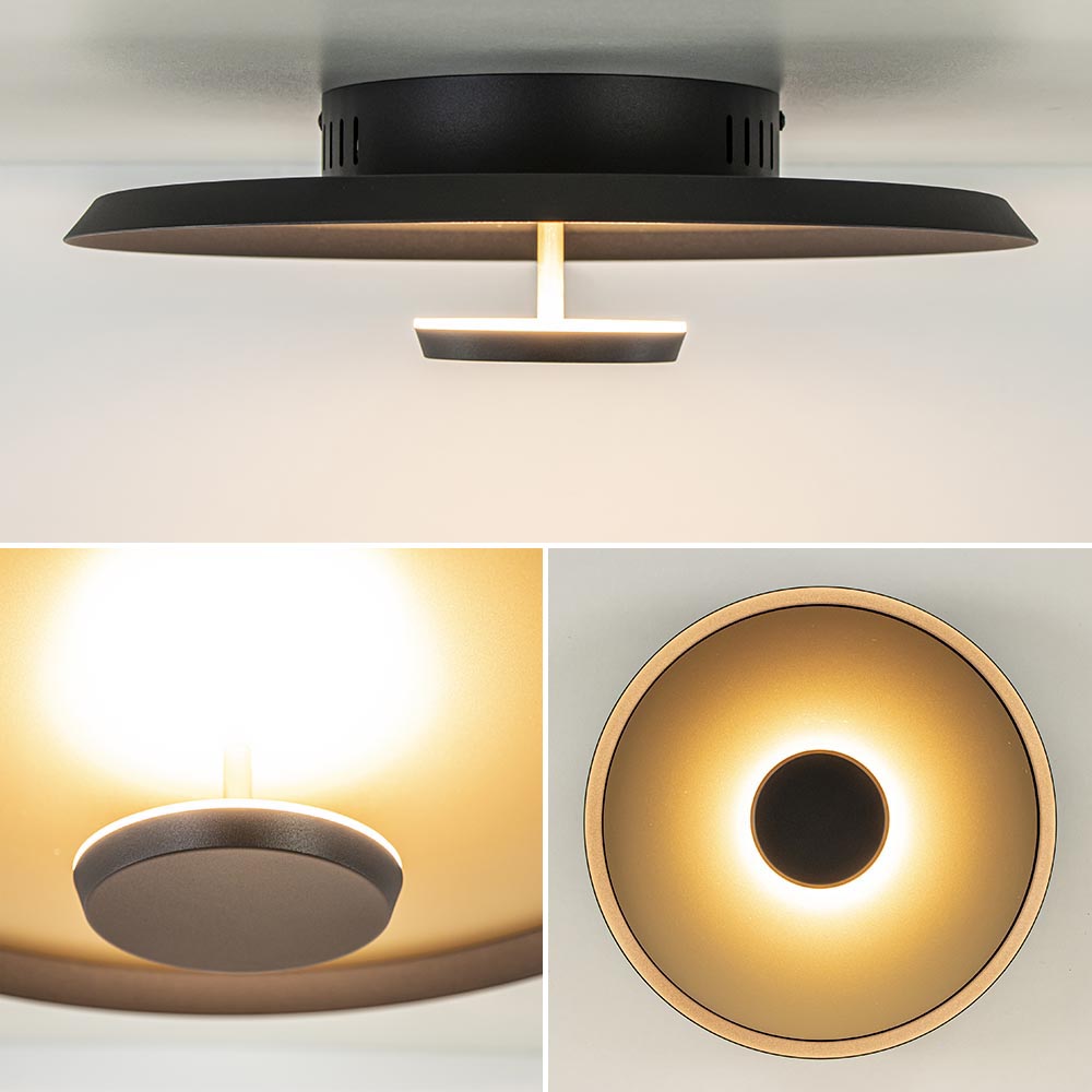 – afmetingen: Ø35.5 x 10 cm – Plafond bevestiging: Ø17 cm – Metaal, mat zwart / goud – geïntegreerd LED – Dimbaar (exclusief) – 2700 Kelvin – 1440 lumen – 16.5 Watt