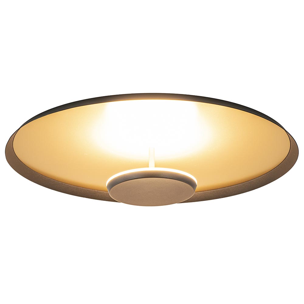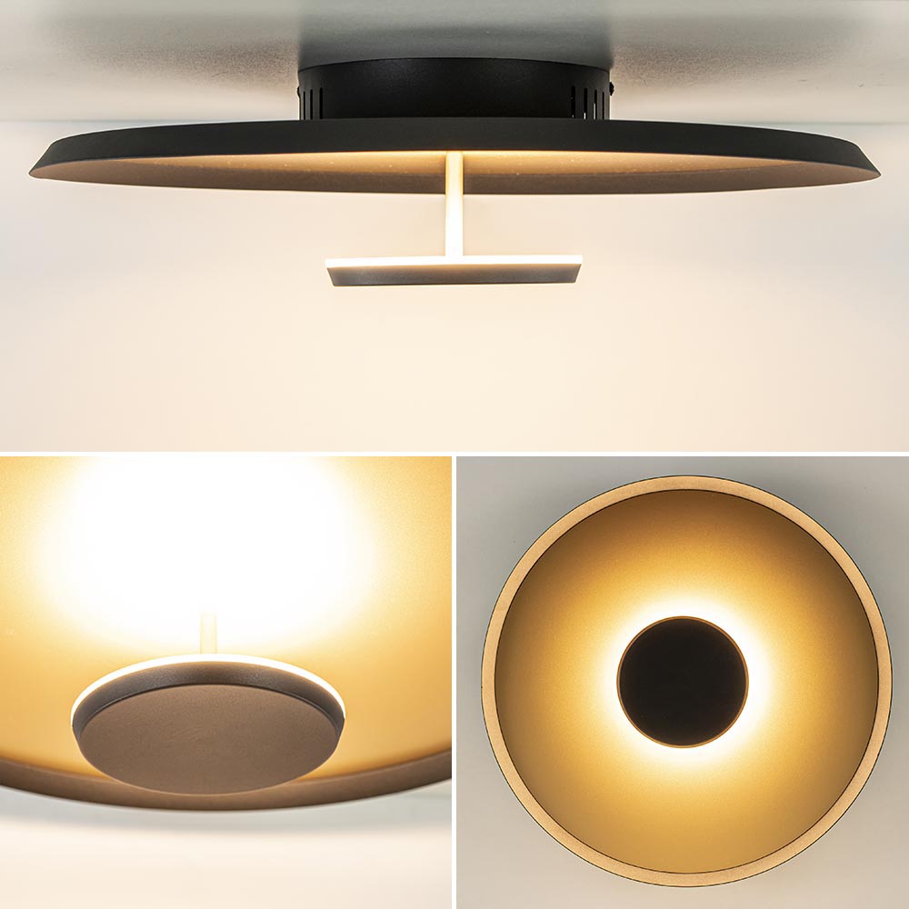 – afmetingen: Ø45.5 x 11 cm – Plafond bevestiging: Ø17 cm – Metaal, mat zwart / goud – geïntegreerd LED – Dimbaar (exclusief) – 2700 Kelvin – 2520 lumen – 27.5 Watt