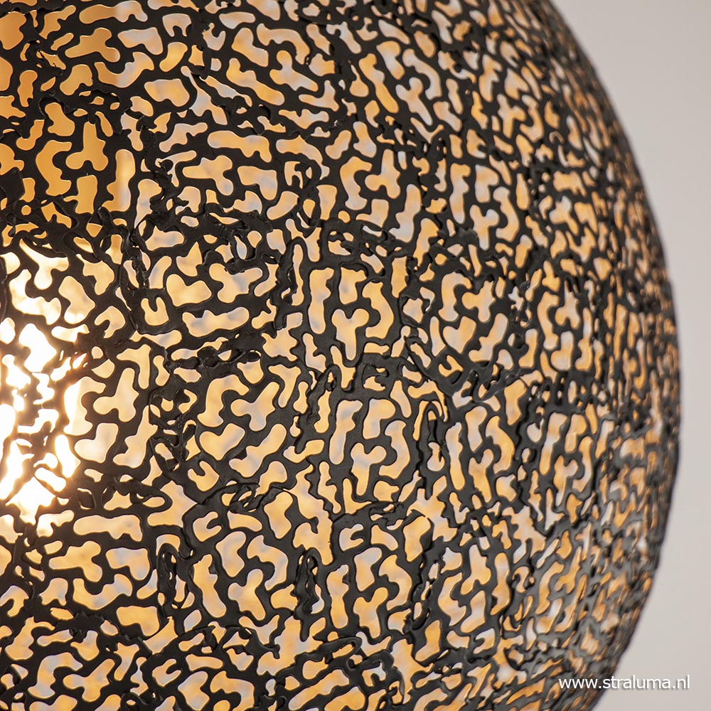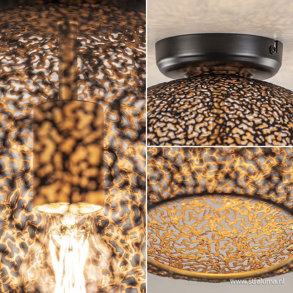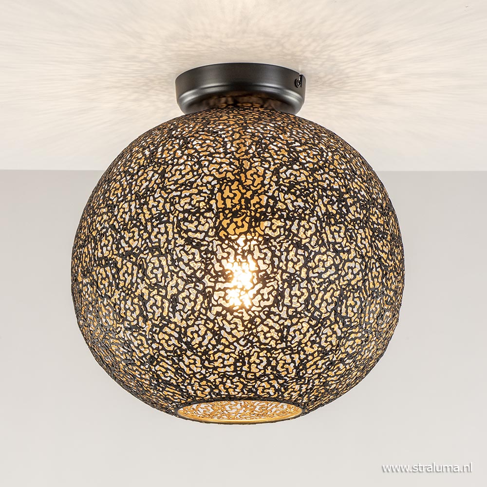 Stoer met een chique uitstraling. Deze moderne plafondlamp doet een beetje denken aan koraal en is gemaakt uit kleine metaaldeeltjes die samen de ronde kap vormen. Het metaal is afgewerkt met een mat zwarte finish aan de buitenzijde en een gouden finish aan de binnenzijde. Het goud zorgt voor een luxe chique uitstraling en creëert tevens een sfeervolle warme gloed. Ook de fitting is afgewerkt in de kleur goud. De zwart gouden bol is bevestigd op een ronde metalen bevestiging. De moderne plafondlamp wordt geleverd zonder lichtbron (E27).