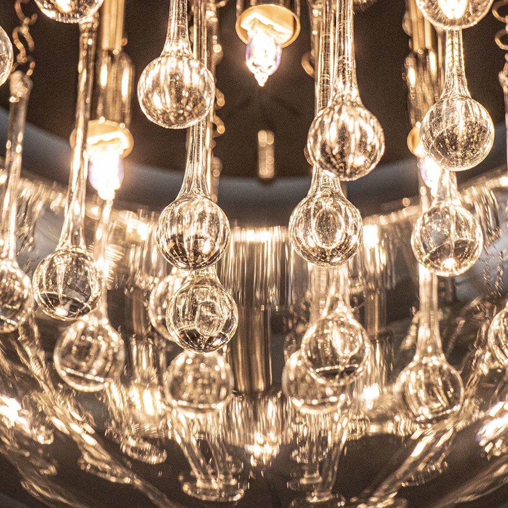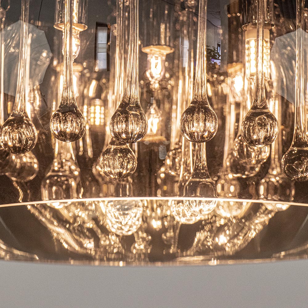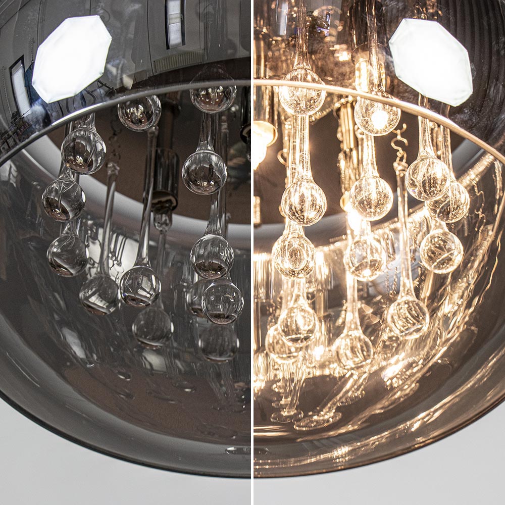 De letterlijk en figuurlijk schitterende plafonnière Pearl wordt met zijn mond geblazen glazen kap van Ø40 cm nog echt ambachtelijk vervaardigd. De kap is het best te omschrijven als zijnde gemaakt van semi transparant rookglas. Door deze combinatie van spiegeling en transparantie heeft de Pearl een zeer luxueuze en warme uitstraling. De transparante glaspegels aan de binnenzijde van de glazen lampenkap maen het geheel af. De Pearl plafonniere is een echte eyecatcher.