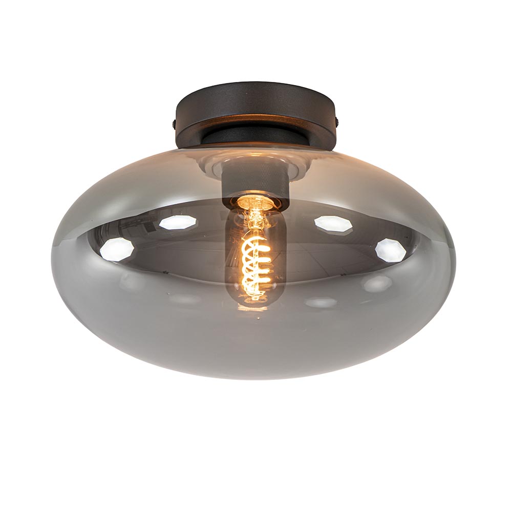 Ideaal voor in een hal, toilet of slaapkamer. Deze plafondlamp voldoet helemaal aan de huidige trends. De plafondlamp bestaat uit een metalen bevestiging met een doorsnede van 12 cm die is voorzien van een mat zwarte finish en een smoke/titanium glazen kap. De kap heeft een ovale vorm en wordt op de bevestiging vastgedraaid dmv schroefdraad. De smoke glazen plafondlamp wordt geleverd zonder lichtbron en is dimbaar middels een externe dimmer (exclusief).