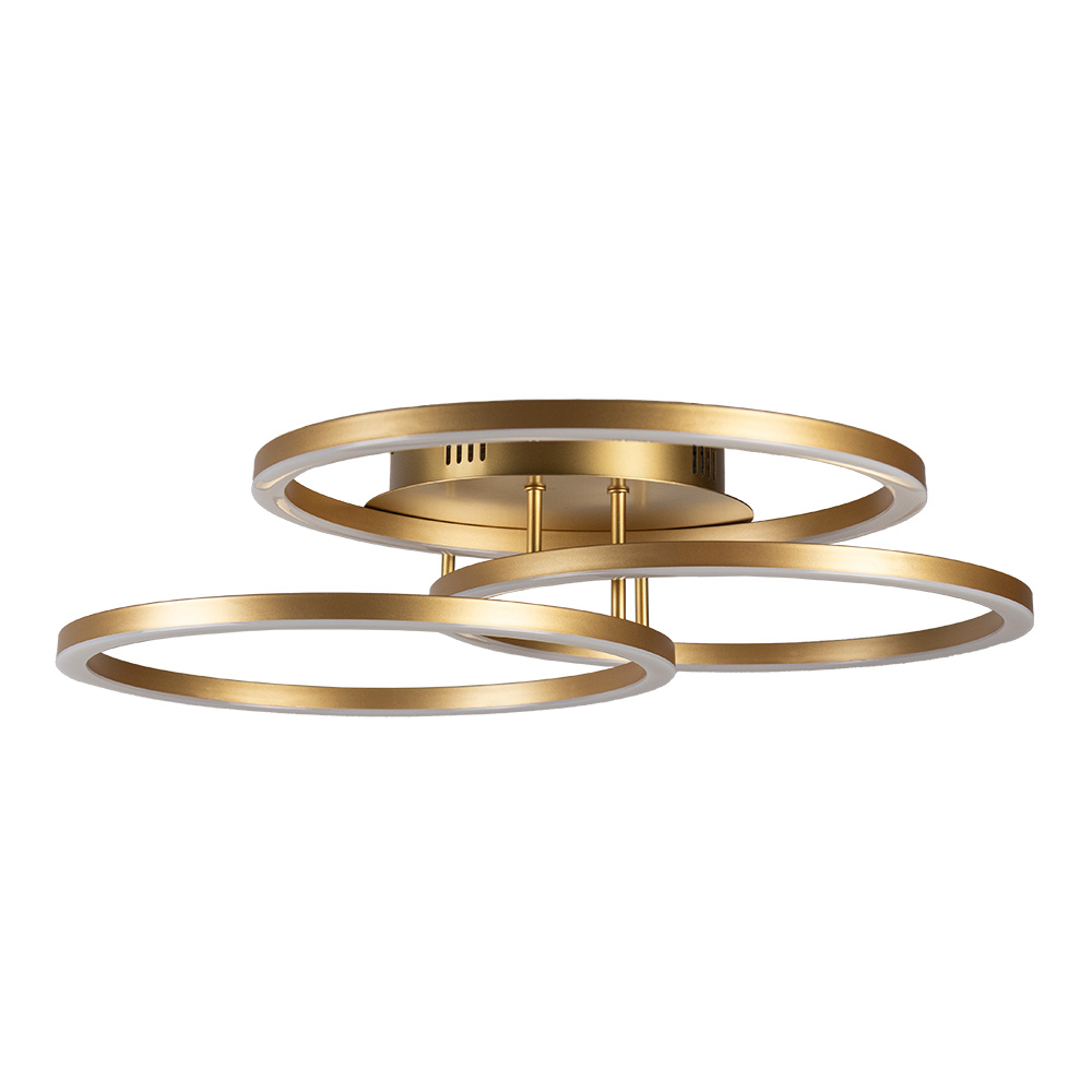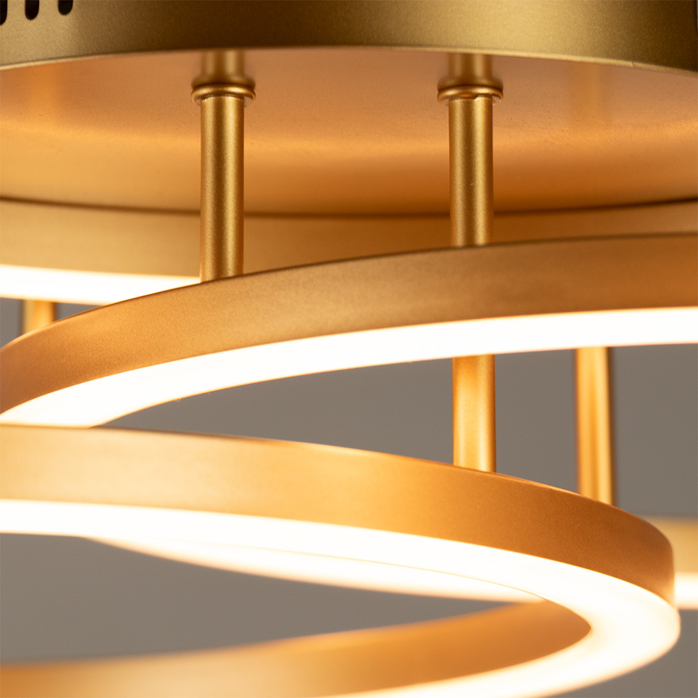 Deze opvallende plafondlamp is een echte blikvanger in elk modern interieur. Het unieke ontwerp met drie zwevende, verlichte ringen creëert een ruimtelijk en speels lichteffect. De gouden afwerking in combinatie met geïntegreerde LED-verlichting zorgt voor een stijlvolle uitstraling. Dankzij de open structuur en indirecte lichtverspreiding ontstaat een sfeervolle en gelijkmatige verlichting. Deze lamp komt perfect tot zijn recht in de woonkamer, hal of eetkamer, waar design en functionaliteit samenkomen.